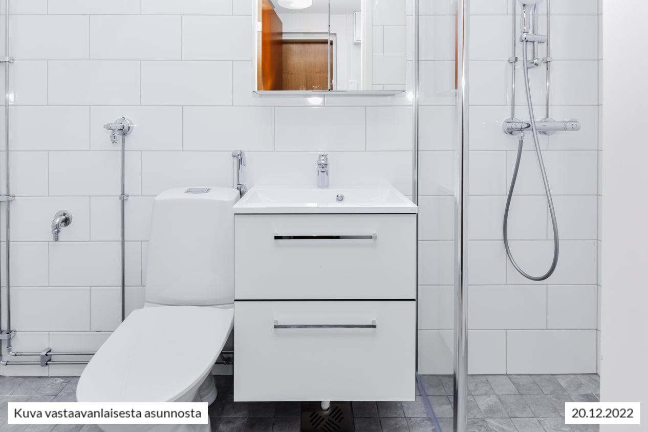 Kylpyhuoneessakin kaikki on uutta ja tilaa on myös omalle pesukoneellesi.