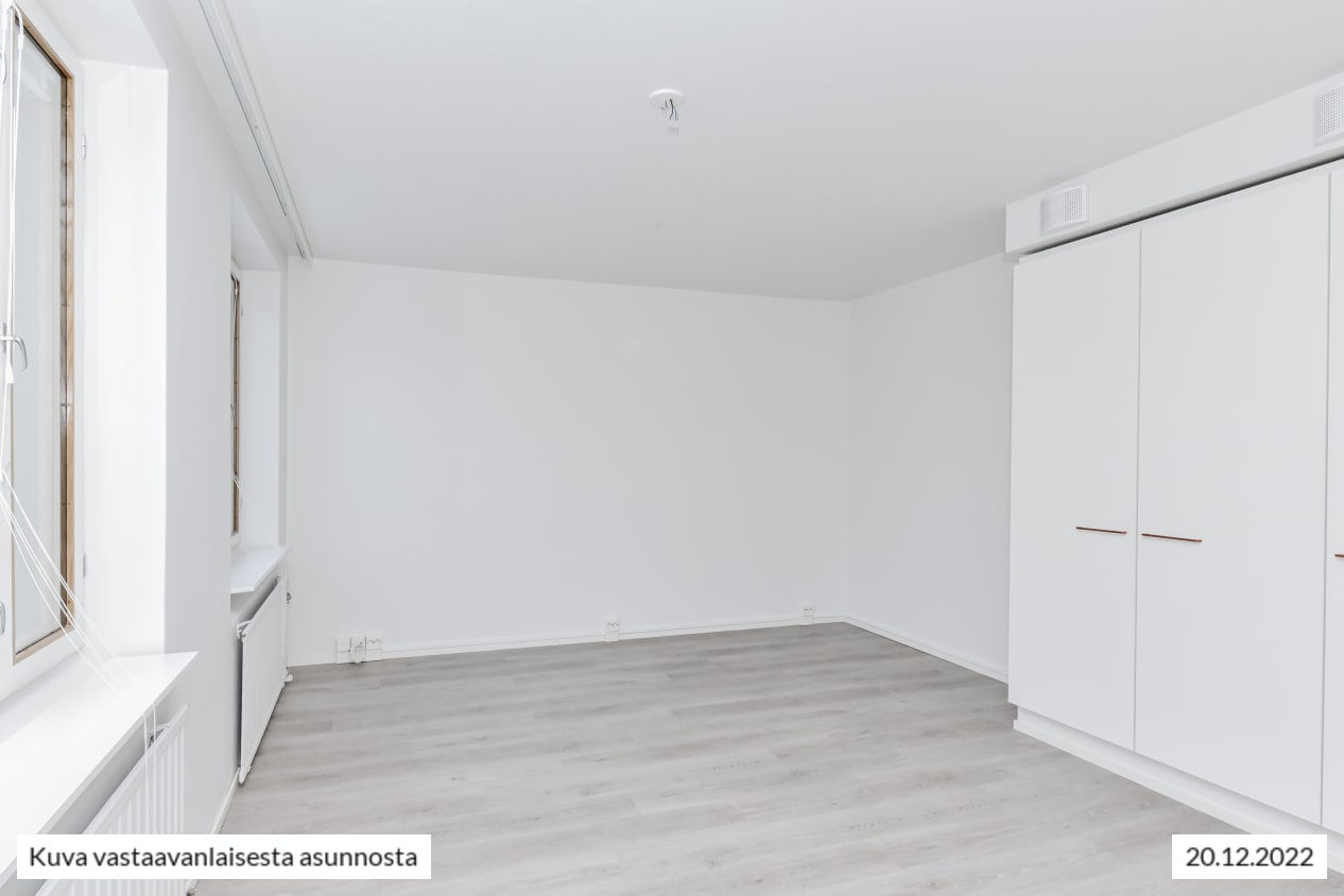 Peruskorjattu pikkukoti saa neliöitään avaramman tunnelmansa isoista, koko olohuoneen levyisistä ikkunoista, joiden ansiosta asuntoon tulvii aamuauringon valo idästä. Yksiön näppärä 1950-luvun pohjaratkaisu on mittasuhteiltaan toimiva, ja sympaattinen asunto on helppo kalustaa monella tapaa.