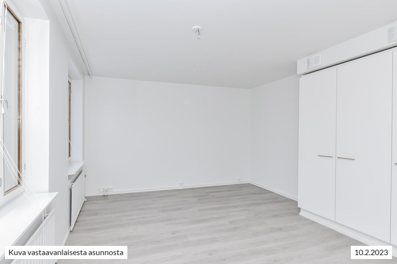 Kompaktin yksiön isot ikkunat avautuvat vehreälle, avaralle pihalle. Pohjaratkaisua jäsentää vaatekaapisto, joka jakaa tilan mukavasti makuusopeksi ja olohuoneeksi. Asunnossa on kodikas 1950-luvun pohjaratkaisu, joka saa tilan tuntumaan neliöitään suuremmalta.