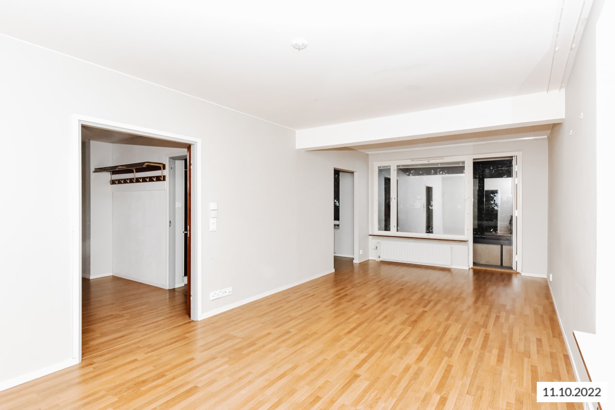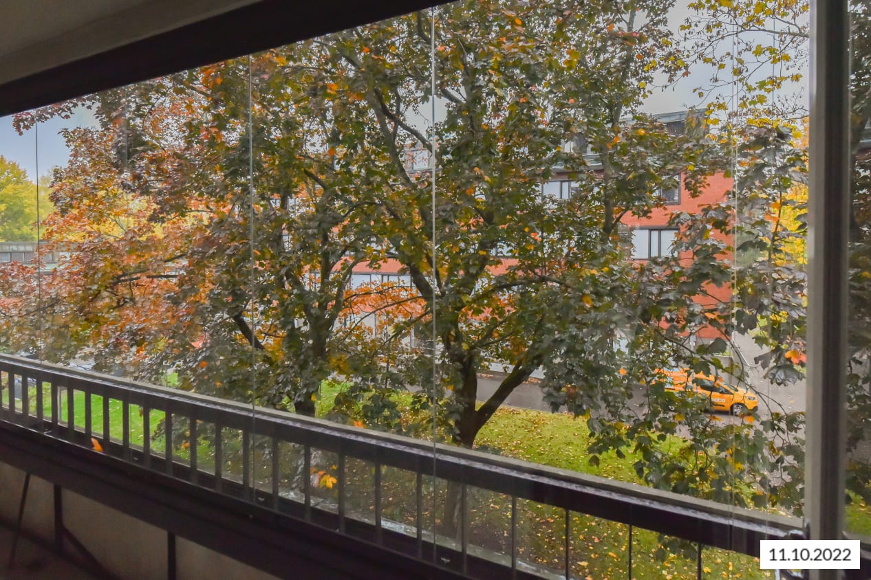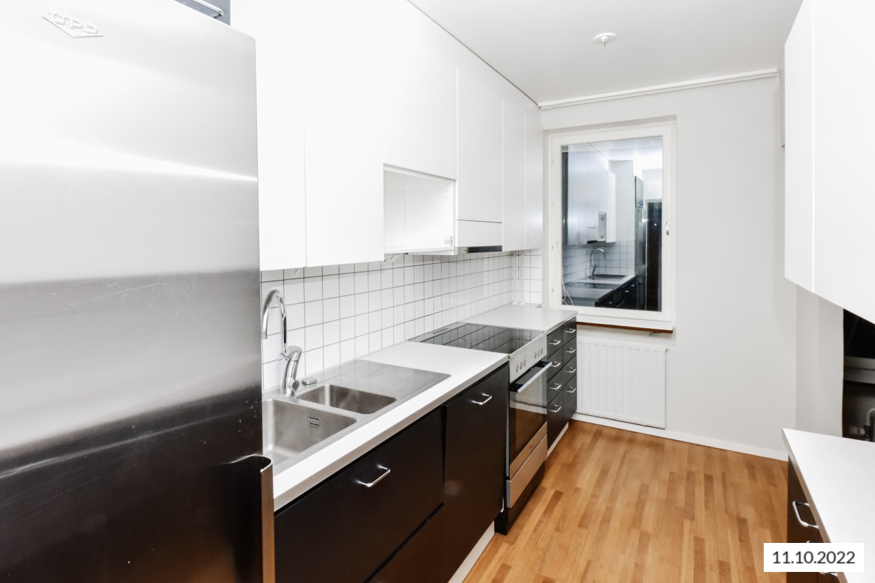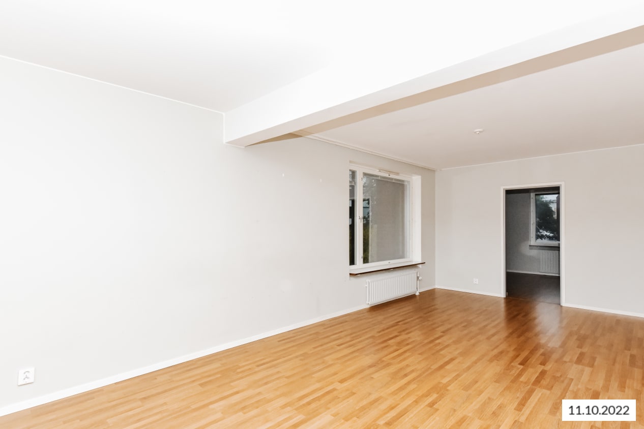 Selkeän päätyasunnon reilun kokoisesta olohuoneesta on käynti lasitetulle länsiparvekkeelle, jossa viihtyy viileämpinäkin iltoina. Isot ikkunat tuovat valon ja ympäröivät maisemat osaksi kotia. Keittiö aukeaa hulppeaan olohuoneeseen, josta löytyy paikka isommallekin ruokapöydälle.