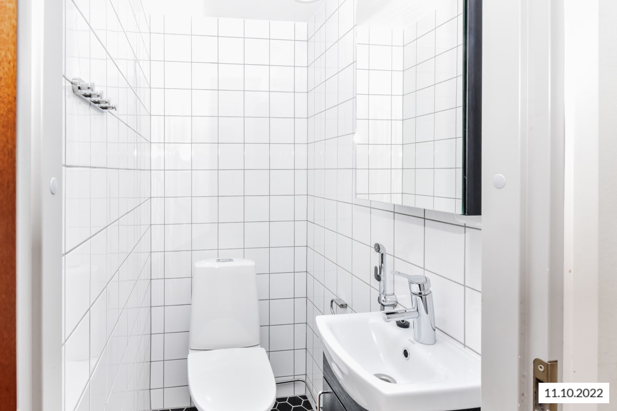 Asuintilojen lattiat ovat käytännöllistä tammilaminaattia. Keittiön yläkaapit ovat kiiltävän valkoiset ja alakaappien ovet ovat mustaa saarniviilua. Ylä- ja alakaappien välitila on laatoitettu valkoisilla laatoilla. Työtasot ovat vaaleaa laminaattia. Varusteina on jääkaappipakastin, keraaminen liesi ja astianpesukone. Astianpesukone on integroitu kalusteisiin ja muiden kodinkoneiden näkyvät osat ovat rosterin värisiä. Kylpyhuoneen seinät on laatoitettu valkoisella laatalla ja lattiat ovat mustaa kuusikulmaista laattaa, allaskaappi on mustaa tammiviilua. Pyykinpesukoneelle ja kuivausrummulle on tilavaraus.