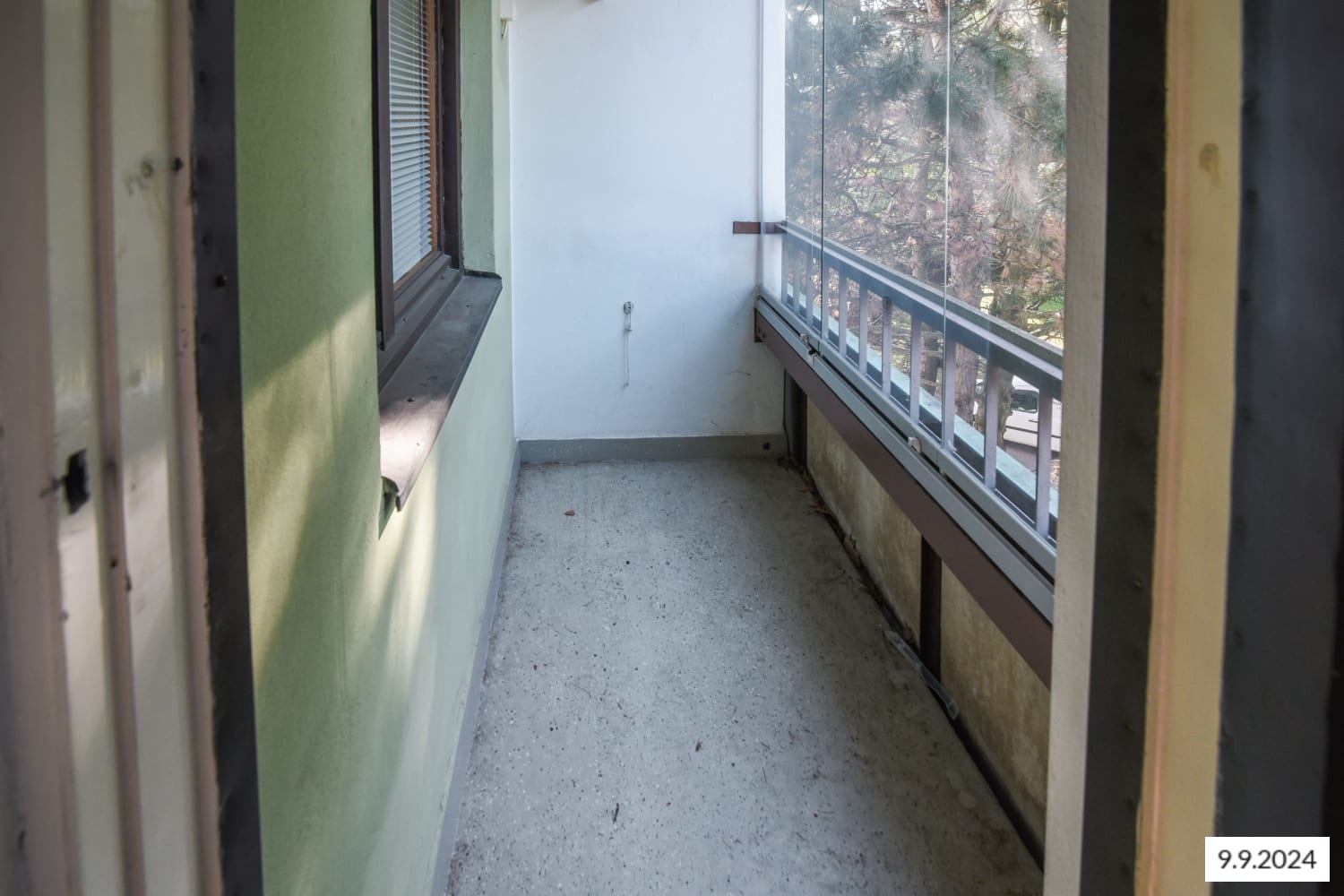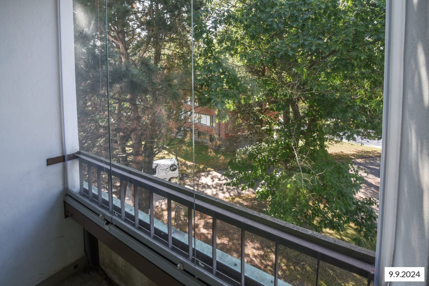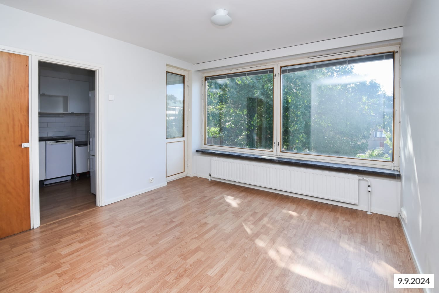 Hyväntuulinen pikkukoti varastaa huomion asuinhuoneen isolla ikkunalla, joka tuo vehreän pihamaiseman osaksi sisustusta. Lasitettu parveke avautuu ilta-aurinkoon.