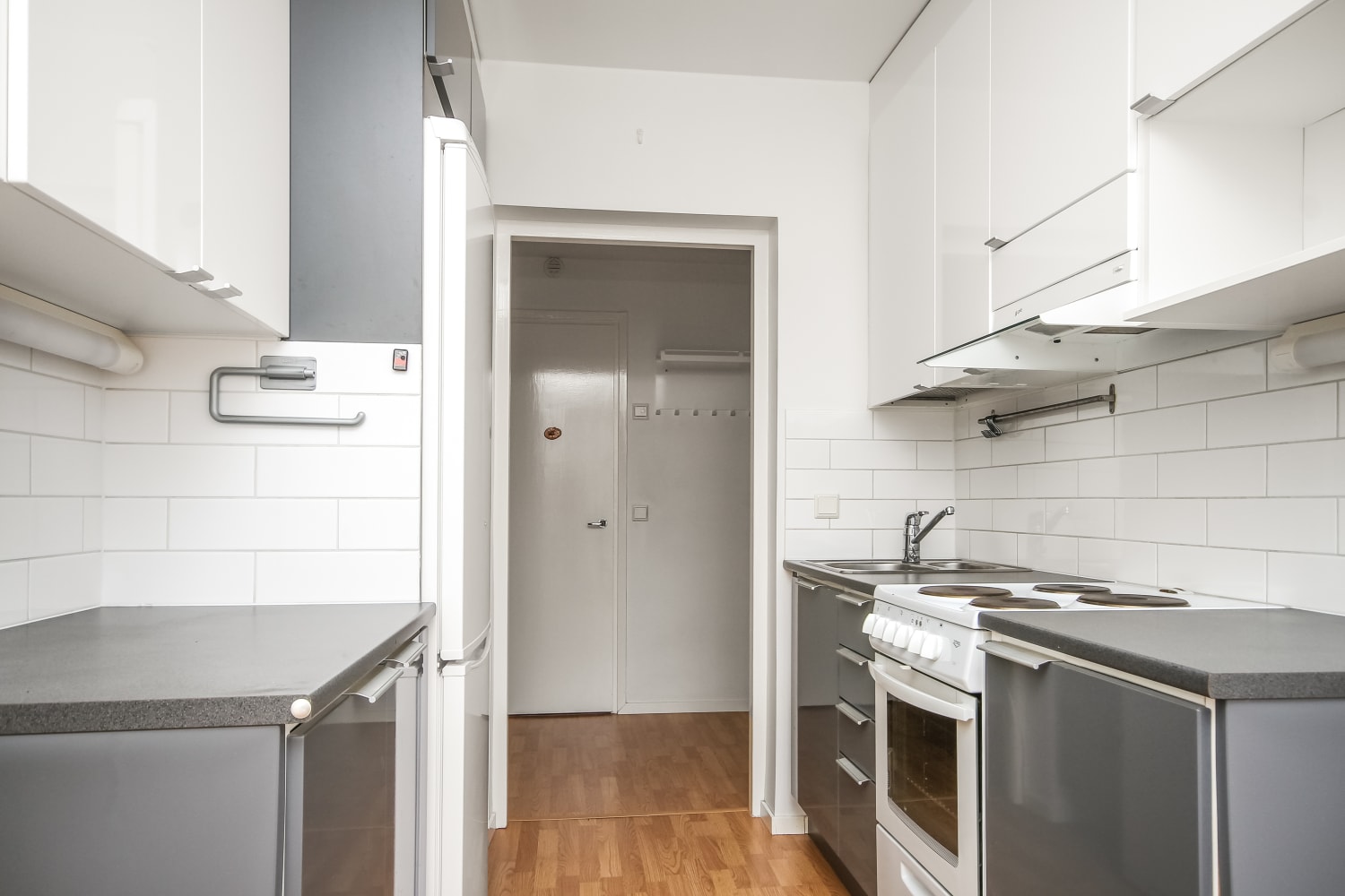 Klassisella 50-luvun pohjaratkaisulla varustettu vuokra-asunto on avara ja seesteinen. Asunnon isot ikkunat tuovat luonnonvalon osaksi sisustusta ja ilta-aurinkoon avautuvalla parvekkeella kelpaa nauttia vehreistä pihamaisemista.