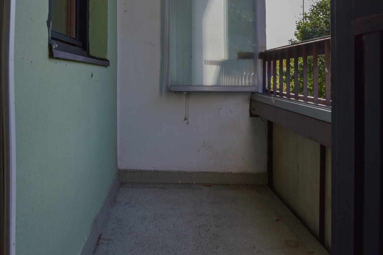 Hyväntuulinen pikkukoti varastaa huomion asuinhuoneen isolla ikkunalla, joka tuo vehreän pihamaiseman osaksi sisustusta. Lasitettu parveke avautuu ilta-aurinkoon.