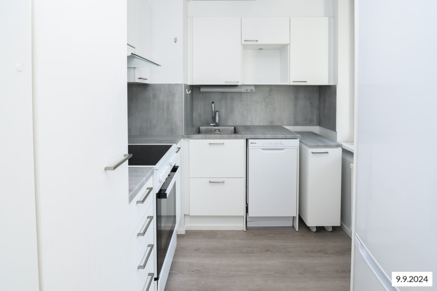 Asuinhuoneissa on tammilaminaattilattiat, kylpyhuoneessa tummanharmaa lattialaatoitus ja hillityn keltainen seinäkaakelointi. Valoisassa keittokomerossa on valkoiset yläkaapistot ja kauniin tummanharmaat alakaapistot, molemmat korkeakiiltoisella pinnoitteella. Tummanharmaa laminaattityötaso ja valkoiset vaakaan ladotut kalustevälikaakeloinnit täydentävät rennon tyylikkään kokonaisuuden. Varusteina ovat astianpesukone, jää-pakastinkaappi ja nelilevyinen sähköliesi.