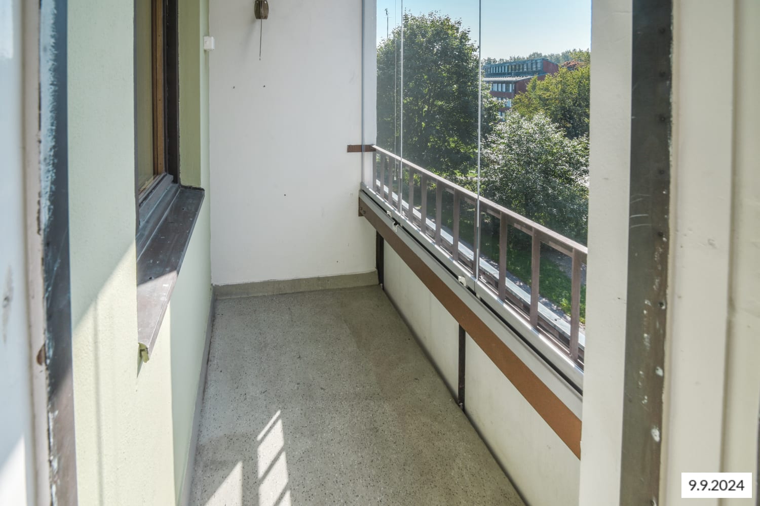 Hyväntuulinen pikkukoti varastaa huomion asuinhuoneen isolla ikkunalla, joka tuo vehreän pihamaiseman osaksi sisustusta. Lasitettu parveke avautuu ilta-aurinkoon.