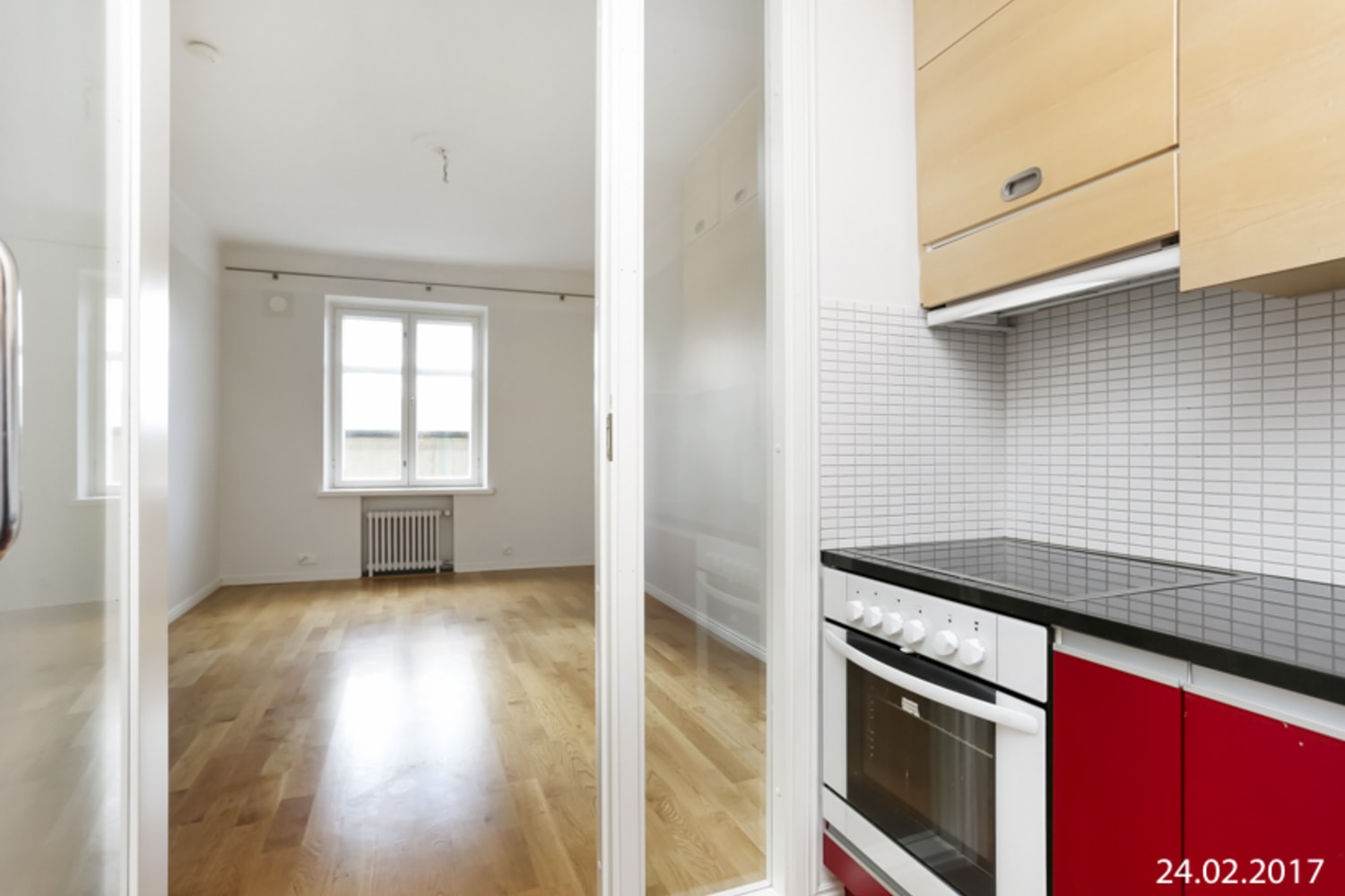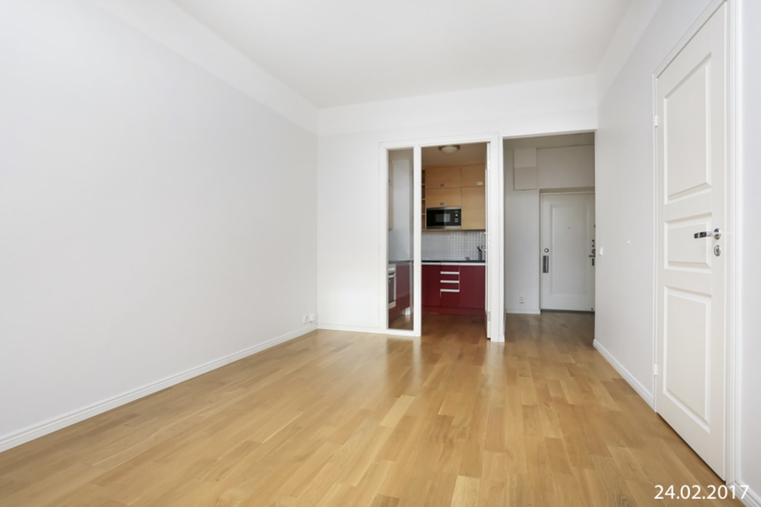 Asuinhuoneissa on kauniit tammiparkettilattiat. Kylpyhuoneen lattiassa on hillityn harmaa laatoitus ja seinissä kermanvalkoiset kaakelit. Sisustusarkkitehdin suunnittelema keittokomero on asunnon katseenvangitsija punaisine alakaapistoineen ja mustine kivitasoineen. Keraaminen liesi on upotettu kivitasoon ja sen alla on alakaappiin integroitu uuni. Astianpesukone ja jääkaappi on integroitu kalusteisiin.