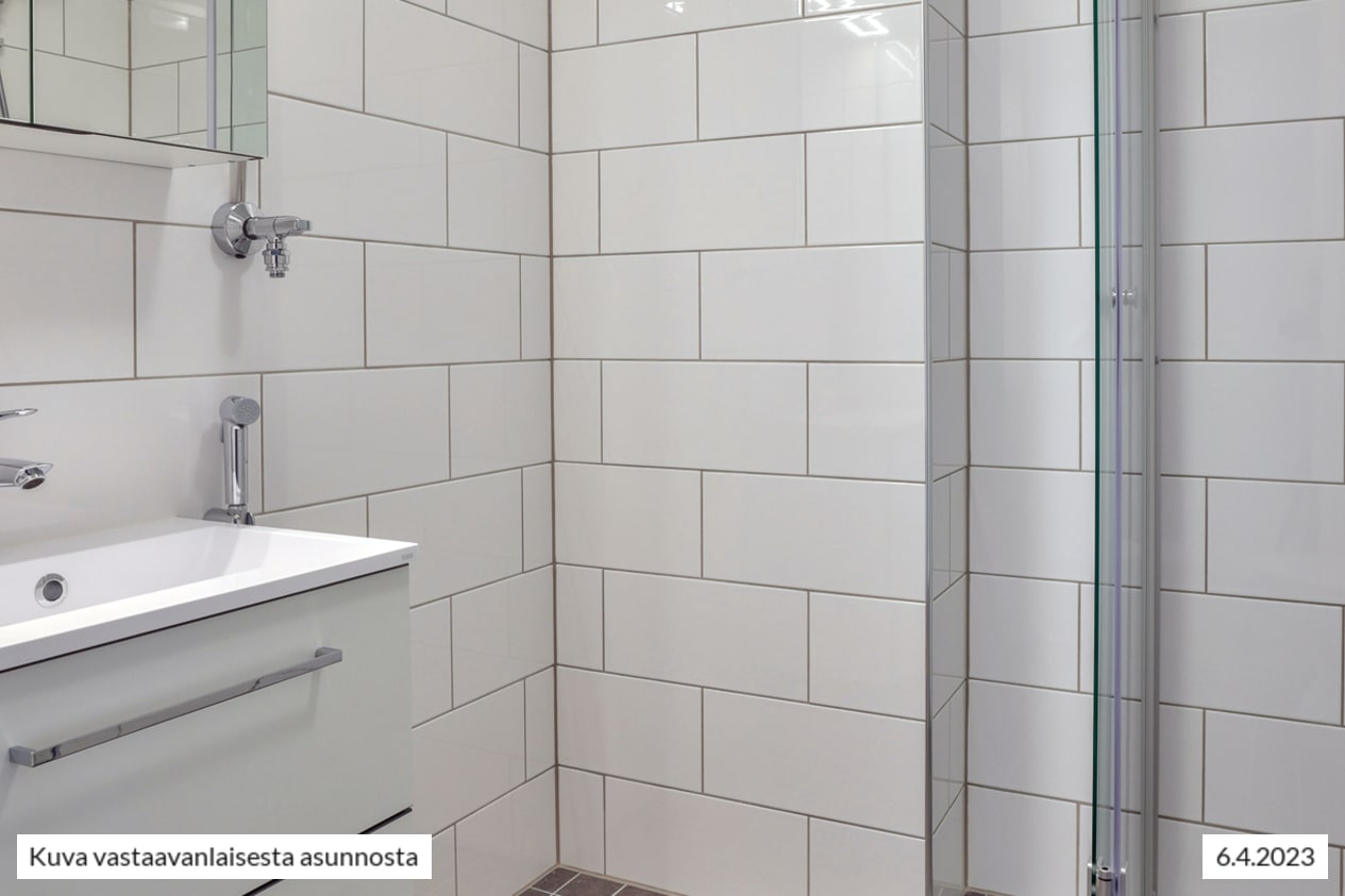 Raikkaassa kylpyhuoneessa on paikka ja liitännät pyykkikoneelle. Kylpyhuone on kalustettu kotimaisilla, kestävillä Kide-kylpyhuonekalusteilla.