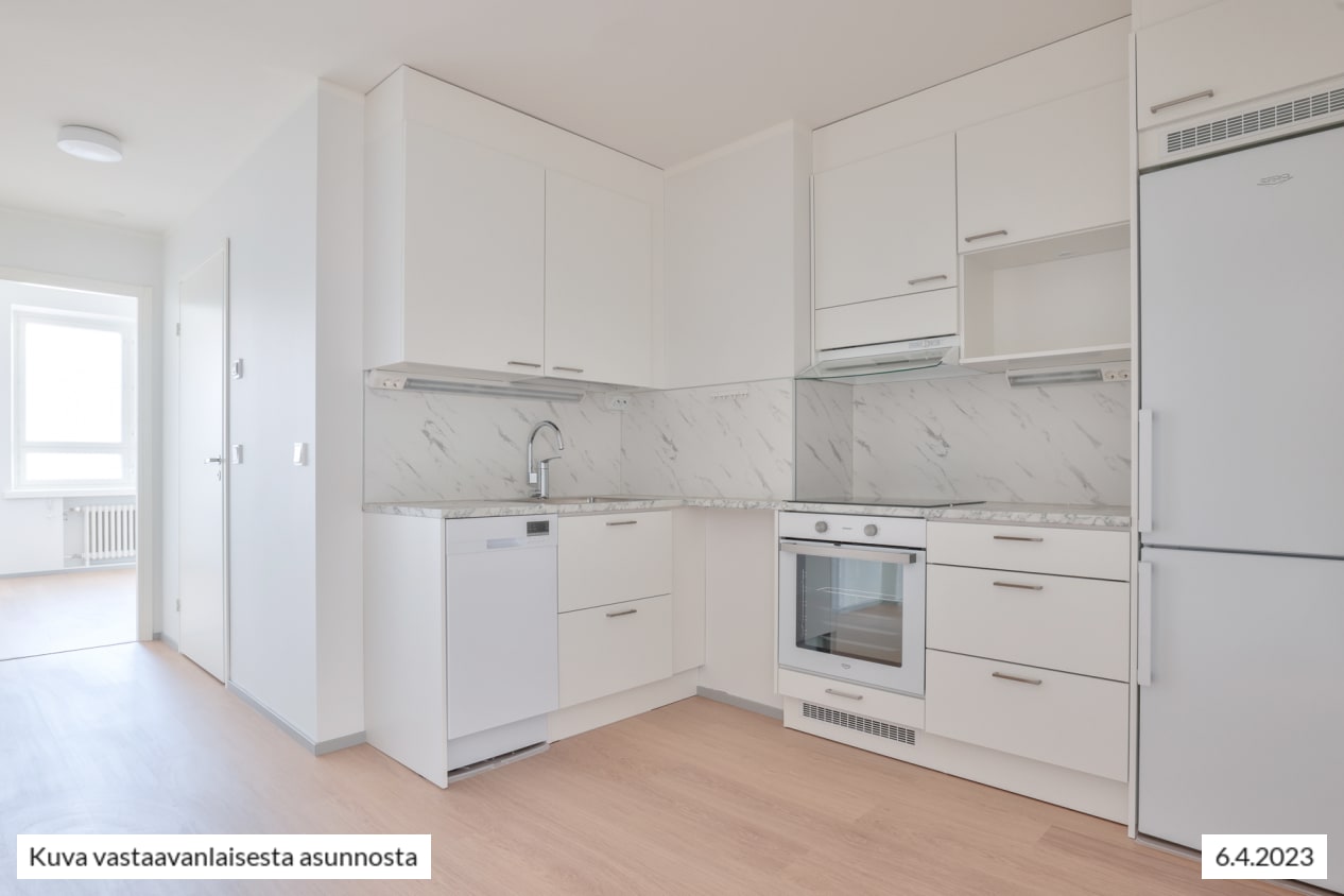 Erillisessä, vaaleasävyisessä keittiössä on neljän keittoalueen keraaminen liesi, astianpesukone, jääkaappipakastin, uuni, paikka mikroaaltouunille sekä runsaasti kaappitilaa. Näppärään, täysin uusittuun kodin keskipisteeseen mahtuu hyvin myös ruokapöytä.