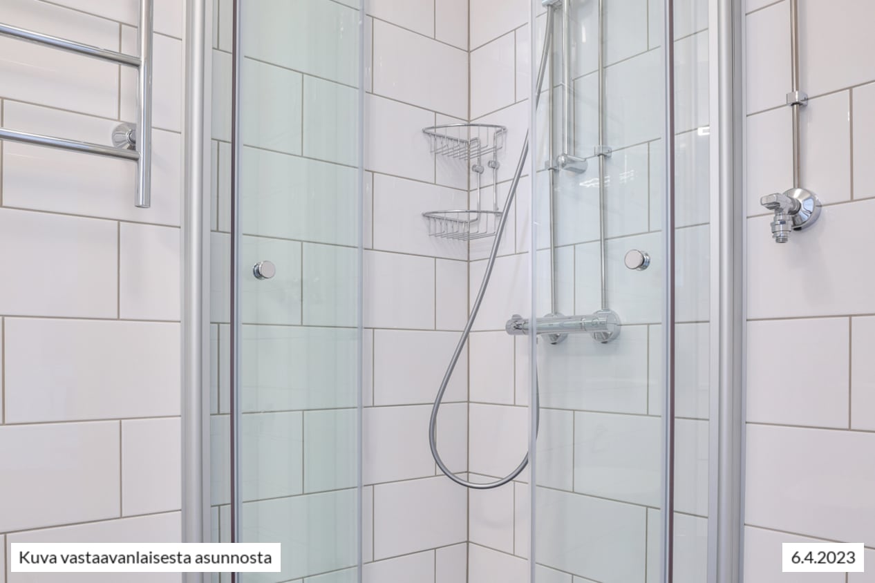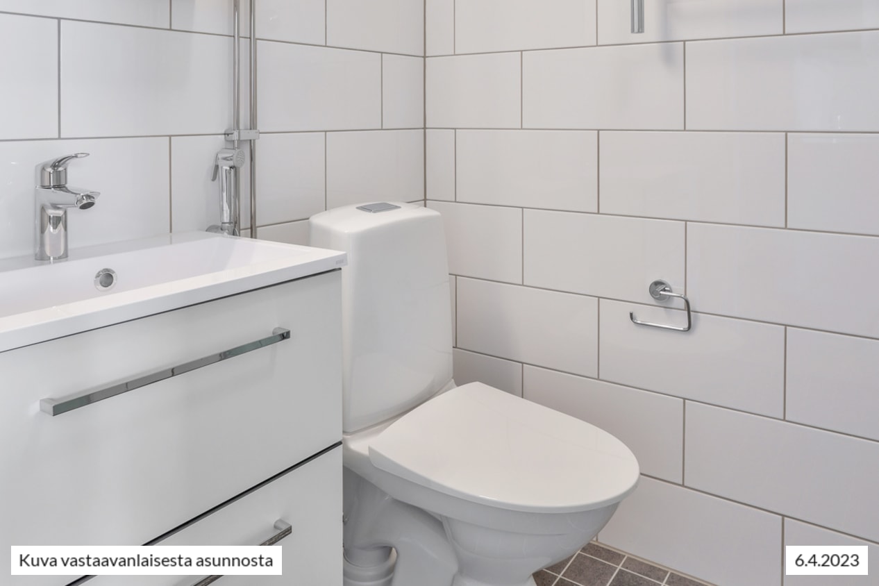 Raikkaassa kylpyhuoneessa on paikka ja liitännät pyykkikoneelle. Kylpyhuone on kalustettu kotimaisilla, kestävillä Kide-kylpyhuonekalusteilla.