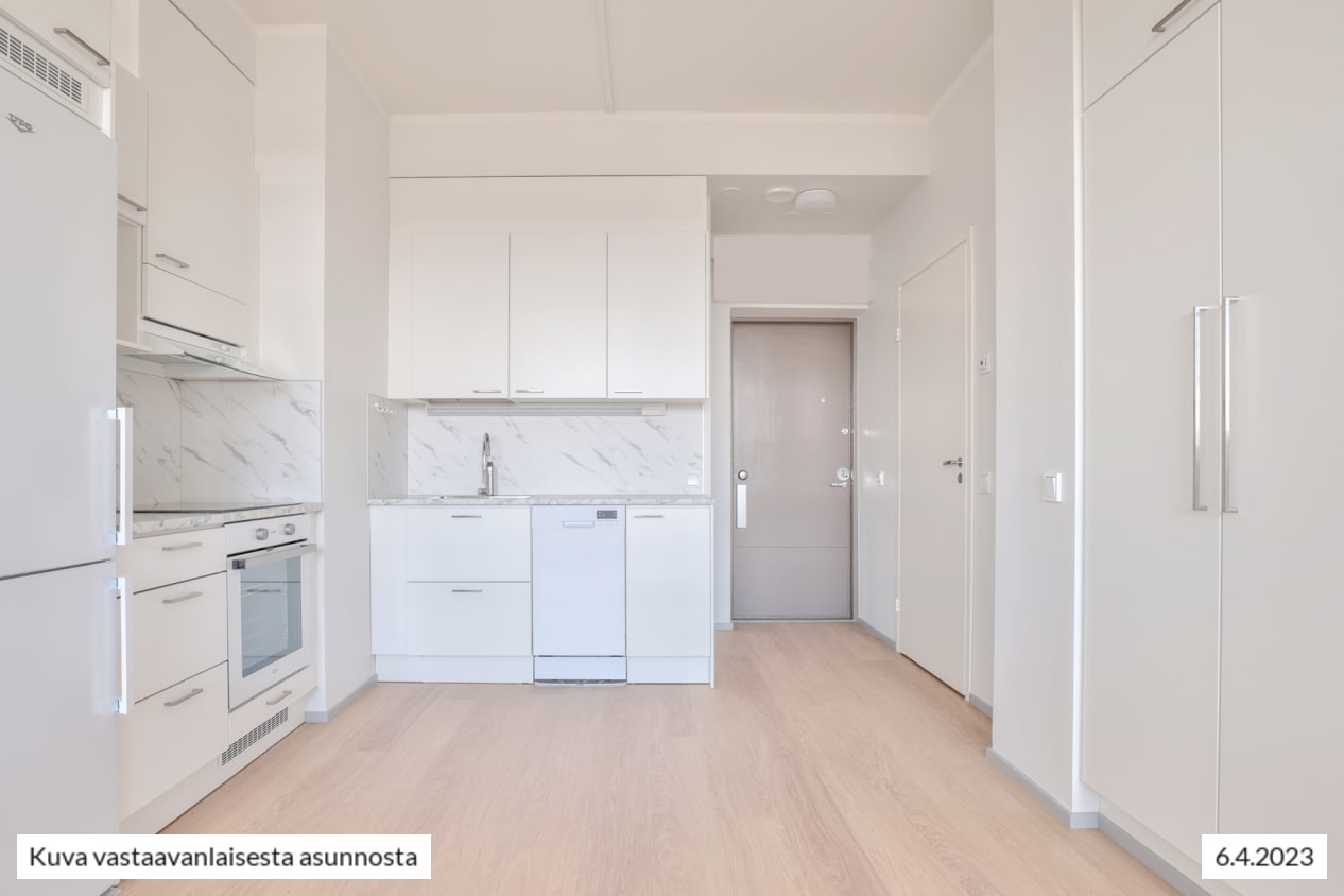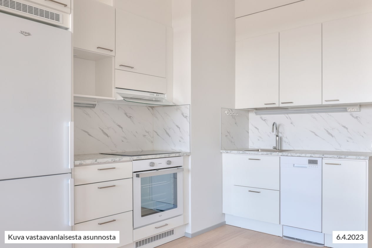 Käytännöllinen keittiö yhdistyy saumattomasti avaraan oleskelutilaan. Vaaleasävyisessä, täysvarustellussa keittotilassa on neljän keittoalueen keraaminen liesi, astianpesukone, jääkaappipakastin, uuni, paikka mikroaaltouunille sekä runsaasti kaappitilaa.