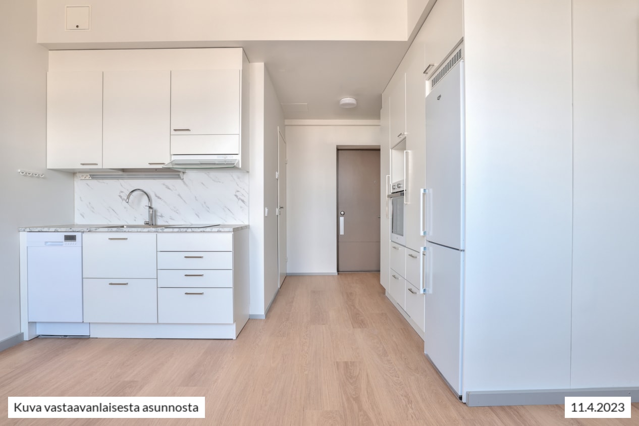 Näppärä, täysin uusittu keittiö on luonteva osa oleskelutilaa. Vaaleasävyisessä, täysvarustellussa keittotilassa on kahden keittoalueen keraaminen liesi, astianpesukone, jääkaappipakastin, uuni, paikka mikroaaltouunille sekä runsaasti kaappitilaa. Lisää säilytystilaa on eteisessä ja oleskelutilan seinäkaapissa.