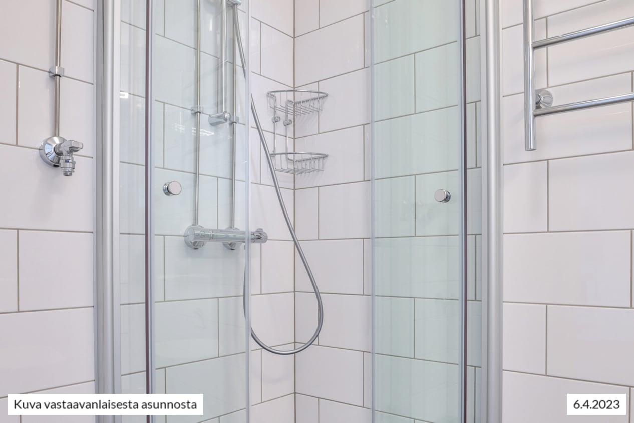 Raikkaassa kylpyhuoneessa on paikka ja liitännät pyykkikoneelle. Kylpyhuone on kalustettu kotimaisilla, kestävillä Kide-kylpyhuonekalusteilla.