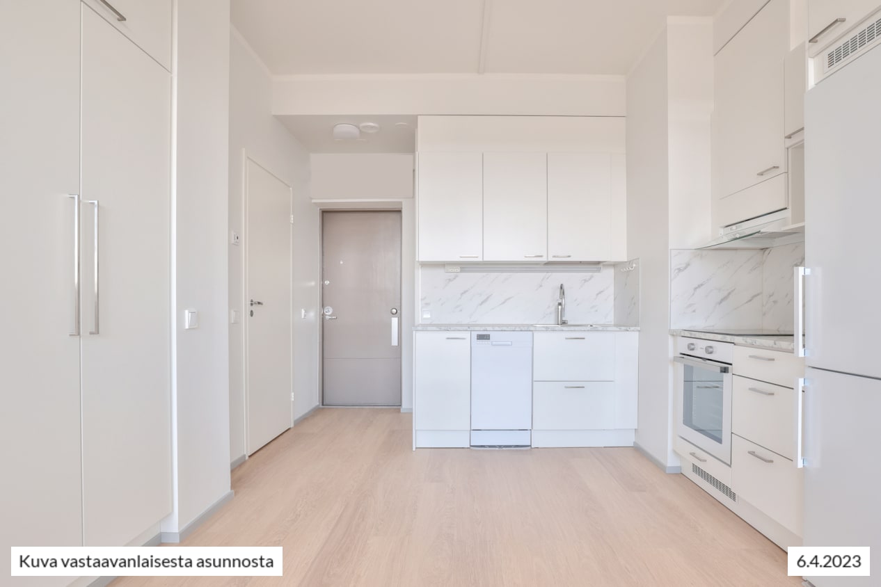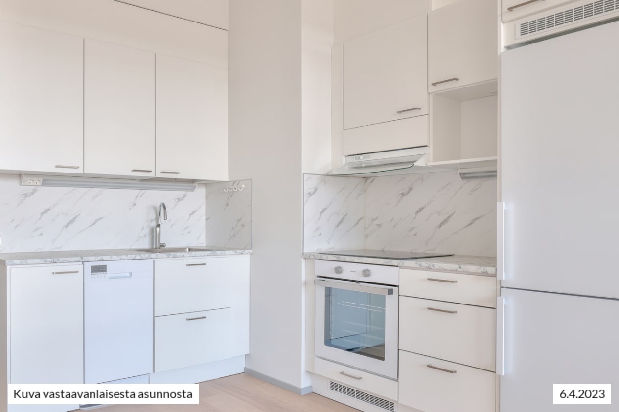 Käytännöllinen keittiö yhdistyy saumattomasti avaraan oleskelutilaan. Vaaleasävyisessä, täysvarustellussa keittotilassa on neljän keittoalueen keraaminen liesi, astianpesukone, jääkaappipakastin, uuni, paikka mikroaaltouunille sekä runsaasti kaappitilaa.