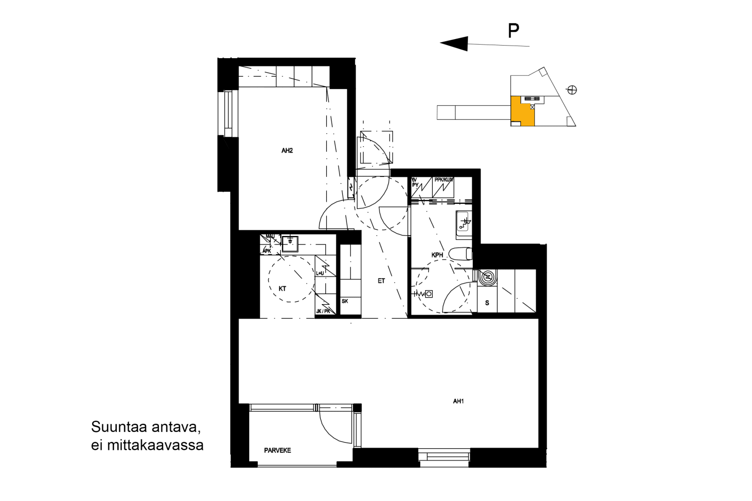 Valoa tulvivan kolmion keittiö ja olohuone muodostavat avaran oleskelualueen, joka jatkuu lasitetulle parvekkeelle. Ruokailutila sopii korkean ikkunan edustalle. Tilava saunaosasto on erinomainen paikka rentoutua päivän päätteeksi.