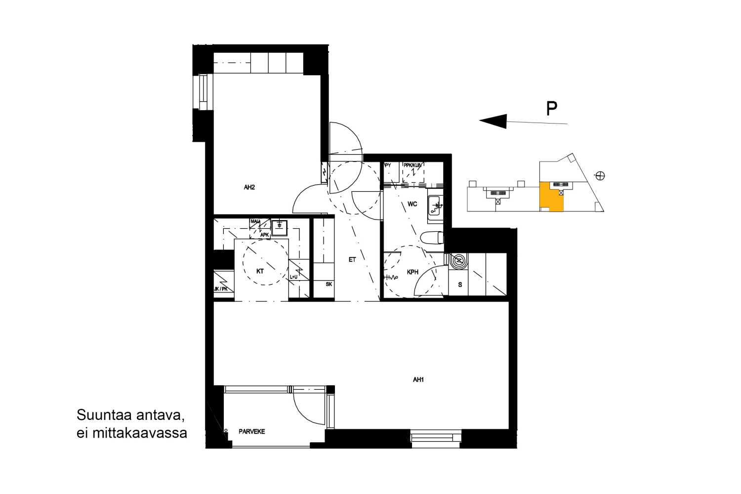 Valoa tulvivan kolmion keittiö ja olohuone muodostavat avaran oleskelualueen, joka jatkuu lasitetulle parvekkeelle. Ruokailutila sopii korkean ikkunan edustalle. Tilava saunaosasto on erinomainen paikka rentoutua päivän päätteeksi.