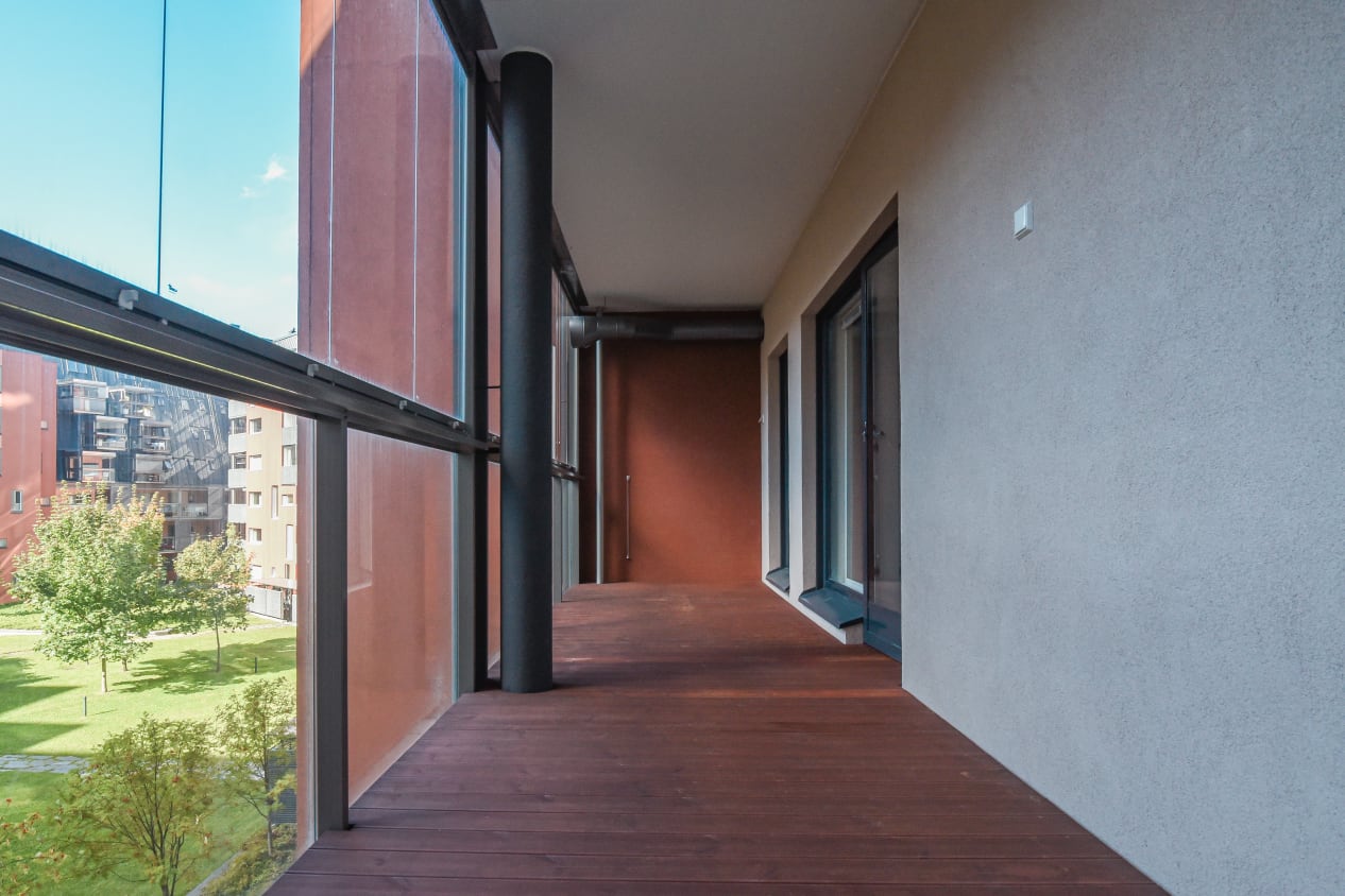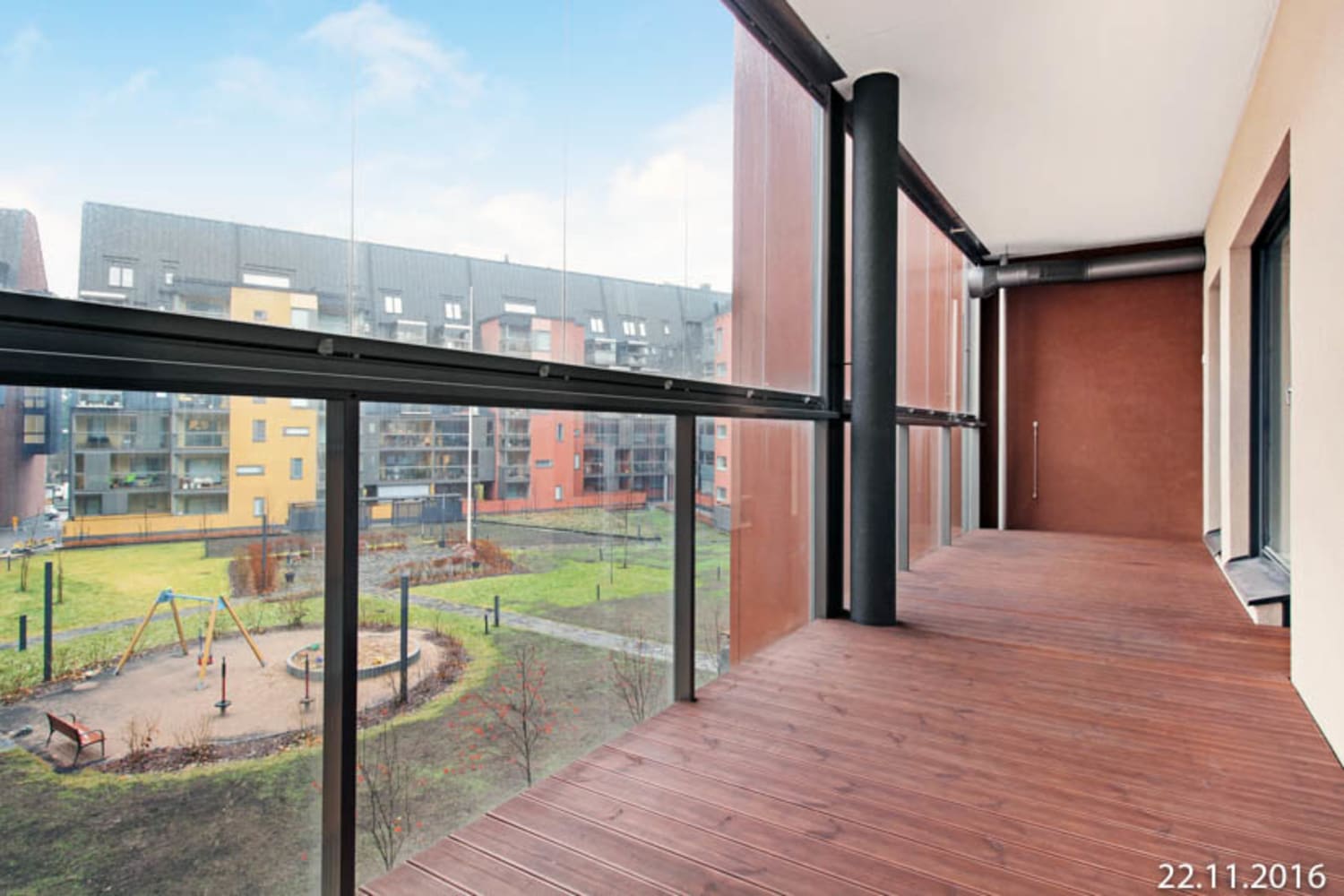 Tunnelmallisen kodin valttina on yli kymmenen neliön parveke, jolta avautuu komea näkymä pihan yli ilta-aurinkoon. Sisätiloissa katse kiinnittyy mehevän tummaksi lakattuun parkettilattiaan ja hyvin varustellun keittiön tasapainoiseen värimaailmaan. Ylellisen kokoinen kylpyhuone ja iso läpikuljettava vaatehuone ovat piste i:n päälle - Tähän asuntoon kannattaa tutustua!