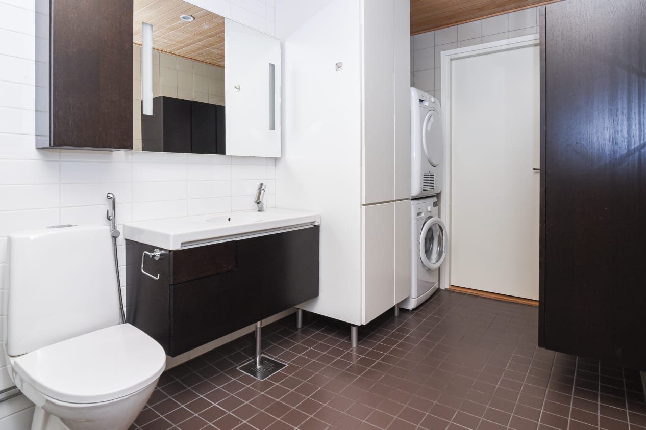 Asuinhuoneissa on lattialämmitys. Eteisen ja keittiön lattiassa on kaakaonruskea laatoitus. Kaakeloidussa kylpyhuoneesssa on mukavuuslattialämmitys, näppärällä avausmekanismilla varustetut selkeälinjaiset säilytyskaapit sekä Idon Seven-vesikalusteet ja Alessi-hanat. Saunan lauteet ovat haapaa ja kiuas Helon Cava. Keittiön vakiovarustuksena on AEG:n astianpesukone, jää-pakastinkaappi, mikroaaltouuni, keraaminen keittotaso ja kiertoilmauuni.