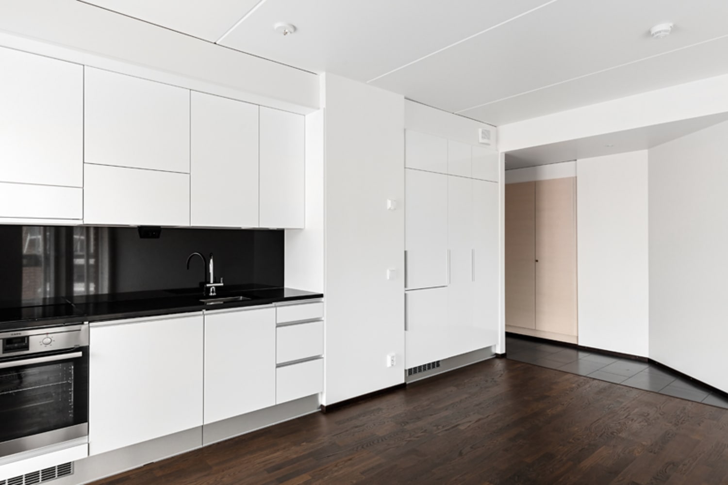 Asuintilojen lattiamateriaalina on sävyltään tumma tammiparketti. Saunassa värit ovat tyylikkäät: lattiassa on tumman harmaa laatoitus, seinissä on isoa kiiltävän valkoista laattaa. Keittiön kaapistot ovat kiiltävän valkoiset ja jämäkkyyttä tilaan tuovat mustat kvartsikomposiittityötasot ja tasojen ja kaapistojen välitilat. Varusteina on kalusteisiin integroitu astianpesukone ja kylmälaitteet, keraaminen liesitaso ja kalusteuuni.