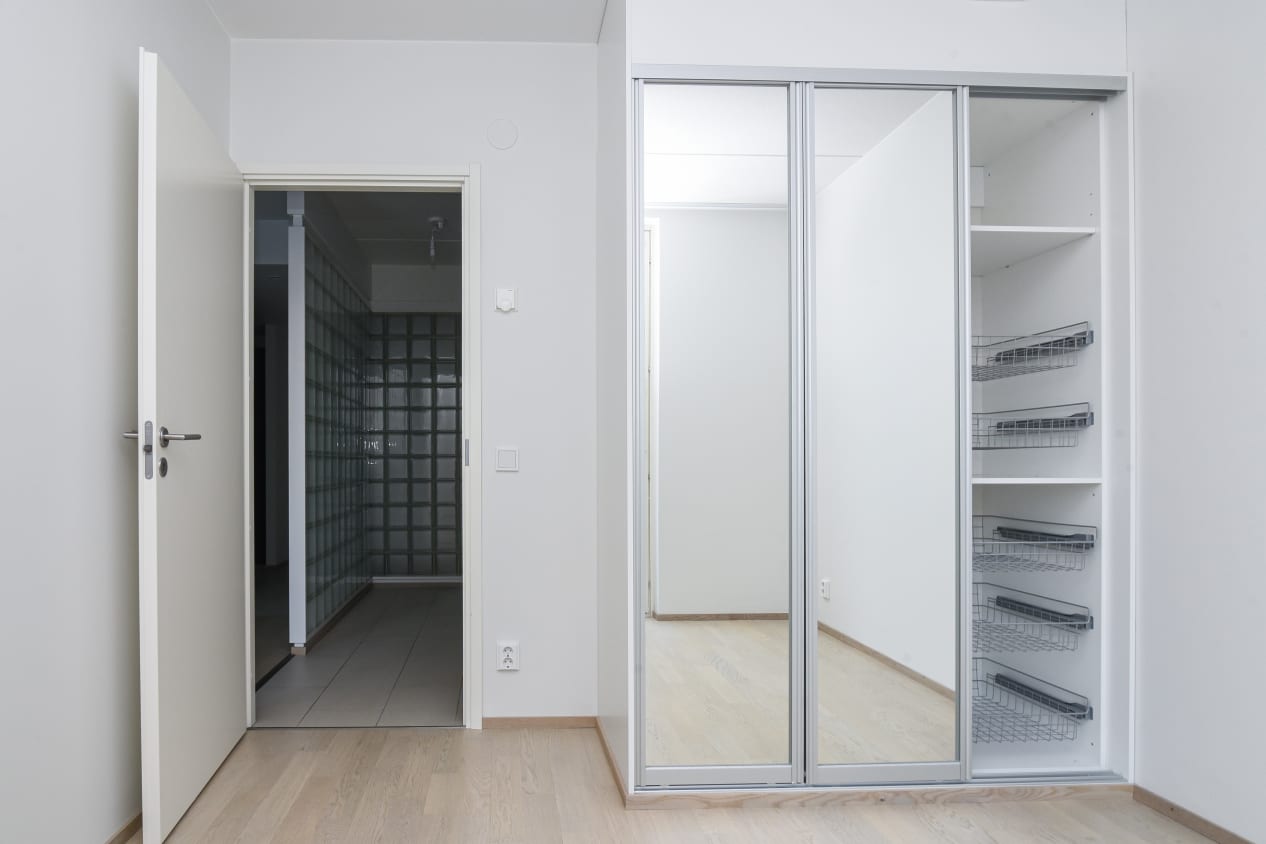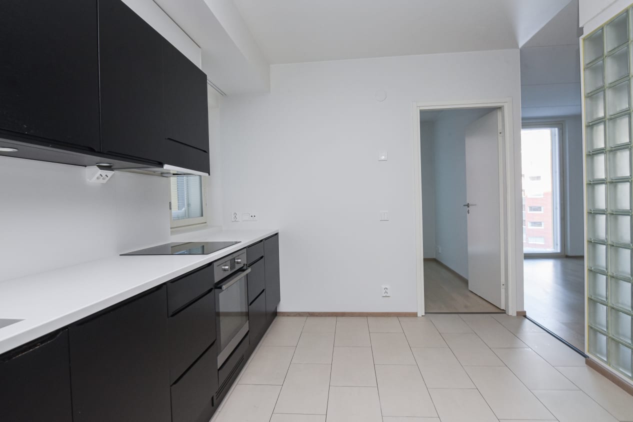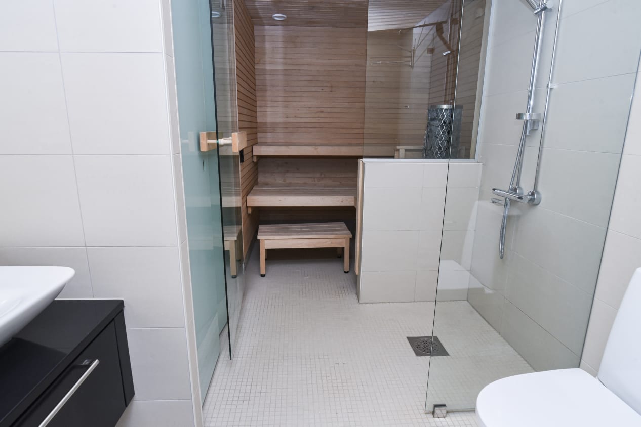 Tyylikkään kodin keittiö on avoin olohuoneen suuntaan ja ruokapöytä sopii lasitiiliseinien rajaamaan kulmaukseen. Suojaisan pihan puolelle avautuvalle lasitetulle parvekkeelle pääsee makuuhuoneesta. Eteinen on tilava ja siellä on mukavasti komerotilaa vaatesäilytykselle. Oman saunan löylyistä kelpaa nauttia päivän päätteeksi.