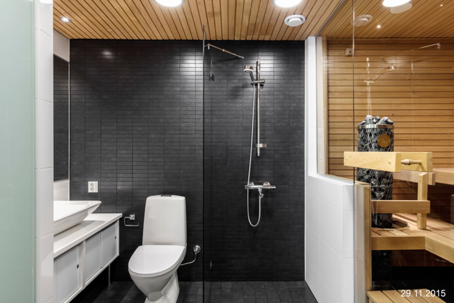 Asuintilojen lattiamateriaalina on sävyltään tumma tammiparketti. Saunassa värit ovat tyylikkäät: lattiassa on tumman harmaa laatoitus, seinissä on isoa kiiltävän valkoista laattaa. Keittiön kaapistot ovat kiiltävän valkoiset ja jämäkkyyttä tilaan tuovat mustat kvartsikomposiittityötasot ja tasojen ja kaapistojen välitilat. Varusteina on kalusteisiin integroitu astianpesukone ja kylmälaitteet, keraaminen liesitaso ja kalusteuuni.