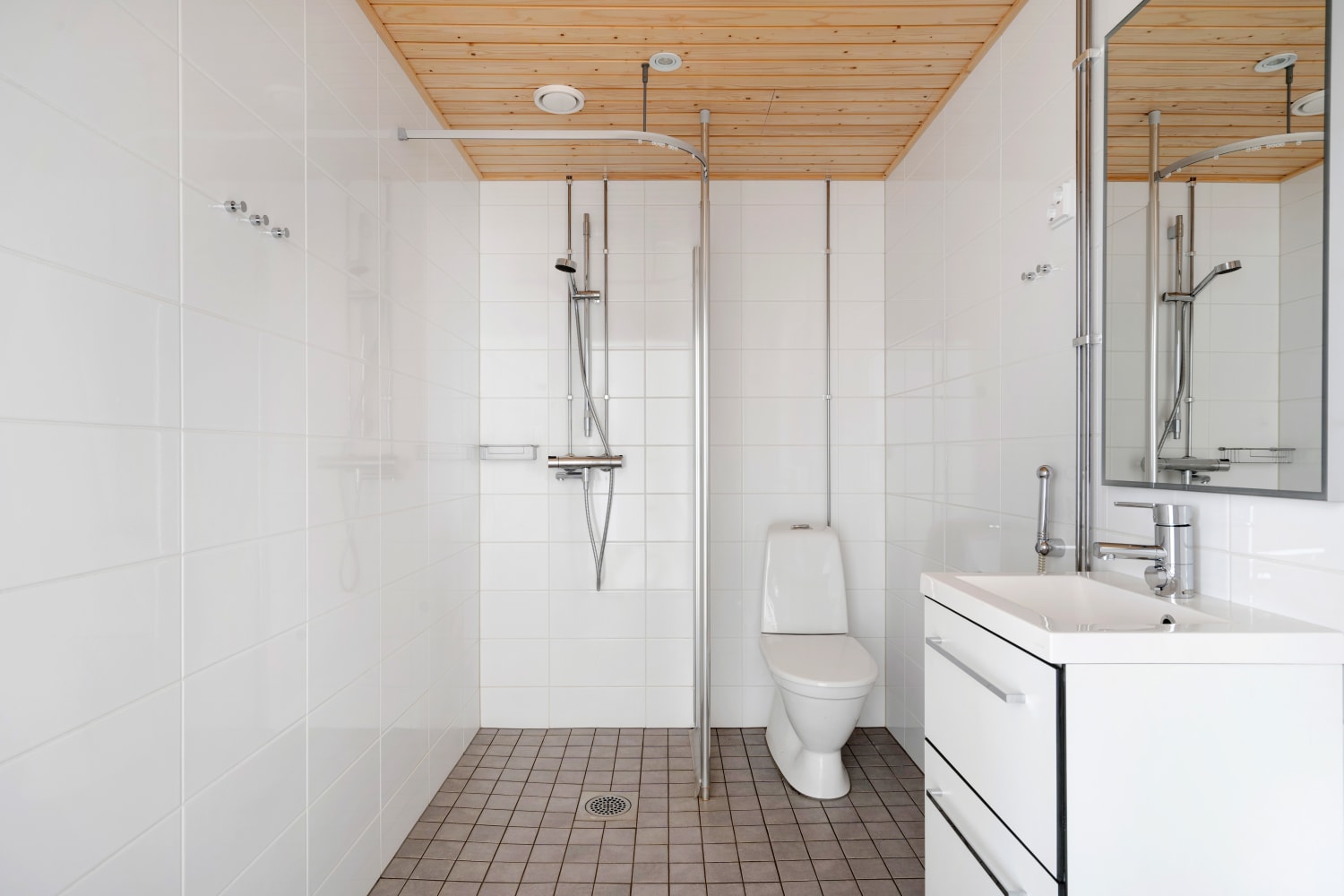 Asuinhuoneissa lattia on vaaleaa tammilaminaattia ja seinät on maalattu valkoisiksi. Ikkunoissa on sälekaihtimet. Keittiön kalusteet ovat raikkaan valkoiset. Ylä- ja alakaappien välinen tila ja työtaso ovat harmaata laminaattia. Keittiön varustukseen kuuluu jääkaappipakastin, astianpesukone, keraaminen liesi ja liesikupu sekä varaus mikroaaltouunille. Kodinkoneet ovat valkoisia. Kylpyhuoneessa kalusteet ovat SATOn Kide-mallistoa. Niiden materiaali on erittäin kestävää ja kaunista valkoista massiivilaminaattia. Seinät ovat valkoista laattaa ja lattian laatoituksen sävy on murrettu valkoinen. Pesukoneelle on varaus.