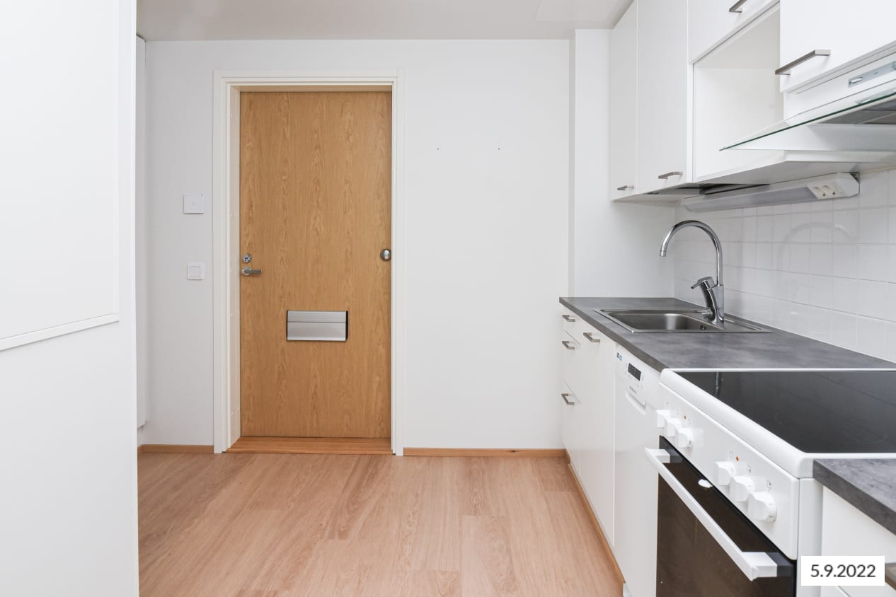Lattia on vaaleaa tammilaminaattia ja seinät on maalattu valkoisiksi. Ikkunoissa on sälekaihtimet. Keittiön kalusteet ovat raikkaan valkoiset. Ylä- ja alakaappien välinen tila ja työtaso ovat harmaata laminaattia. Keittiön varustukseen kuuluu jääkaappipakastin, astianpesukone, keraaminen liesi ja liesikupu sekä varaus mikroaaltouunille. Kodinkoneet ovat valkoisia.