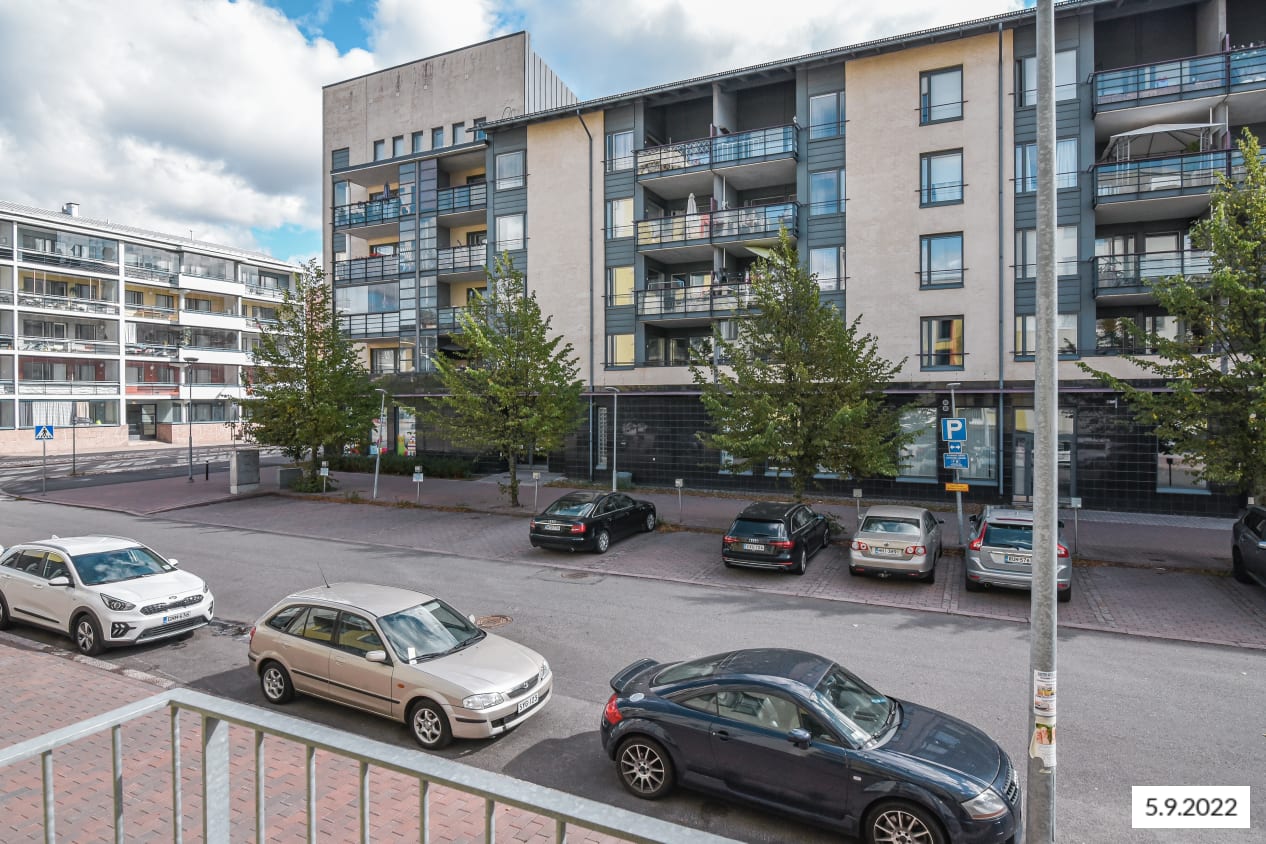 Vaaleasävyisen yksiön keittiötila ja olohuone yhdistyvät selkeäksi oleskelualueeksi, jonka kalustat helposti omaksi pikkukodiksi. Olohuoneen viiston seinän takana, aamuauringon puolella on pieni parveke.