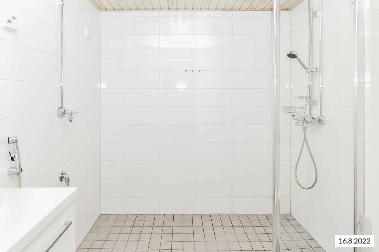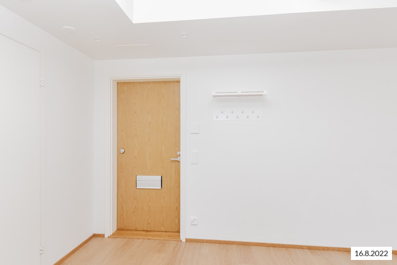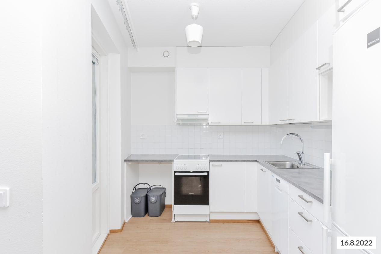 Lattia on vaaleaa tammilaminaattia ja seinät on maalattu valkoisiksi. Ikkunoissa on sälekaihtimet. Keittiön kalusteet ovat raikkaan valkoiset. Ylä- ja alakaappien välinen tila ja työtaso ovat harmaata laminaattia. Keittiön varustukseen kuuluu jääkaappipakastin, astianpesukone, keraaminen liesi ja liesikupu sekä varaus mikroaaltouunille. Kodinkoneet ovat valkoisia. Kylpyhuoneessa kalusteet ovat SATOn Kide-mallistoa. Niiden materiaali on erittäin kestävää ja kaunista valkoista massiivilaminaattia. Seinät ovat valkoista laattaa ja lattian laatoituksen sävy on murrettu valkoinen. Pesukoneelle on varaus.