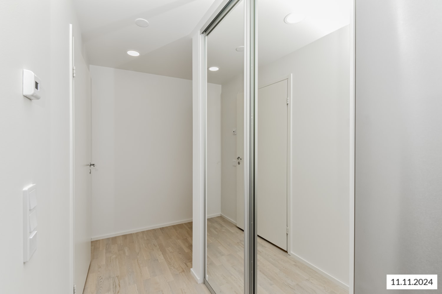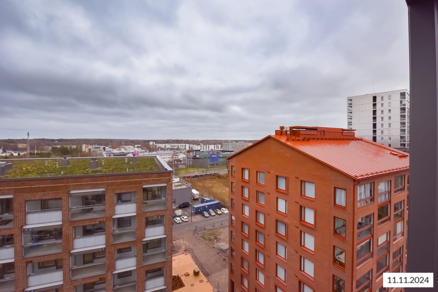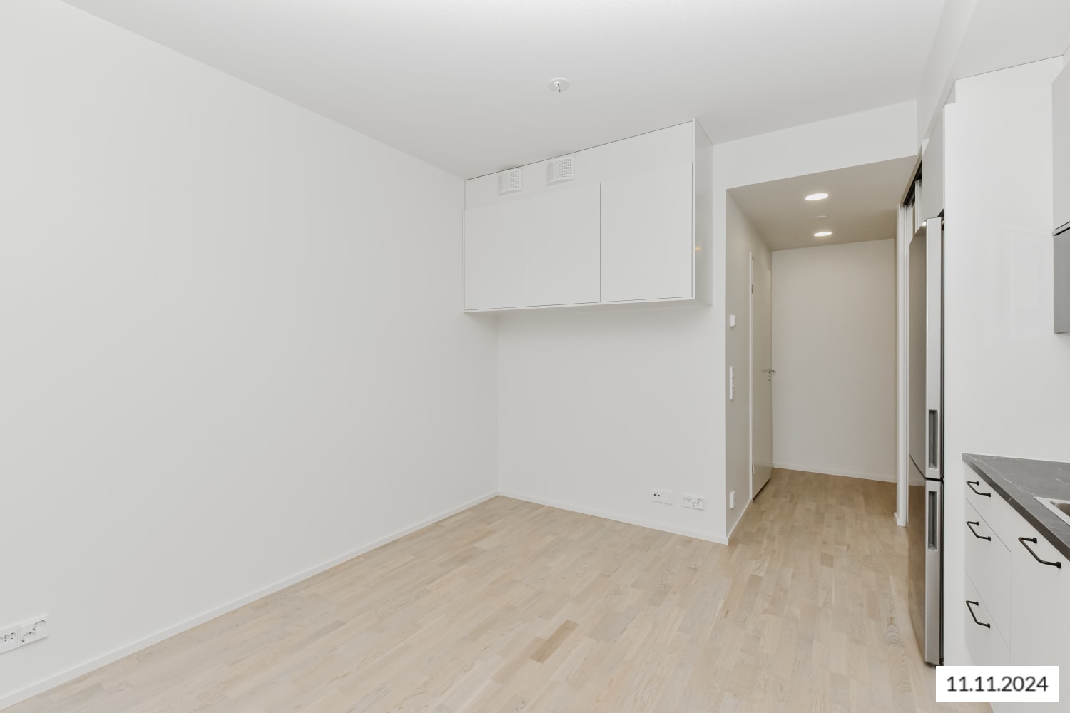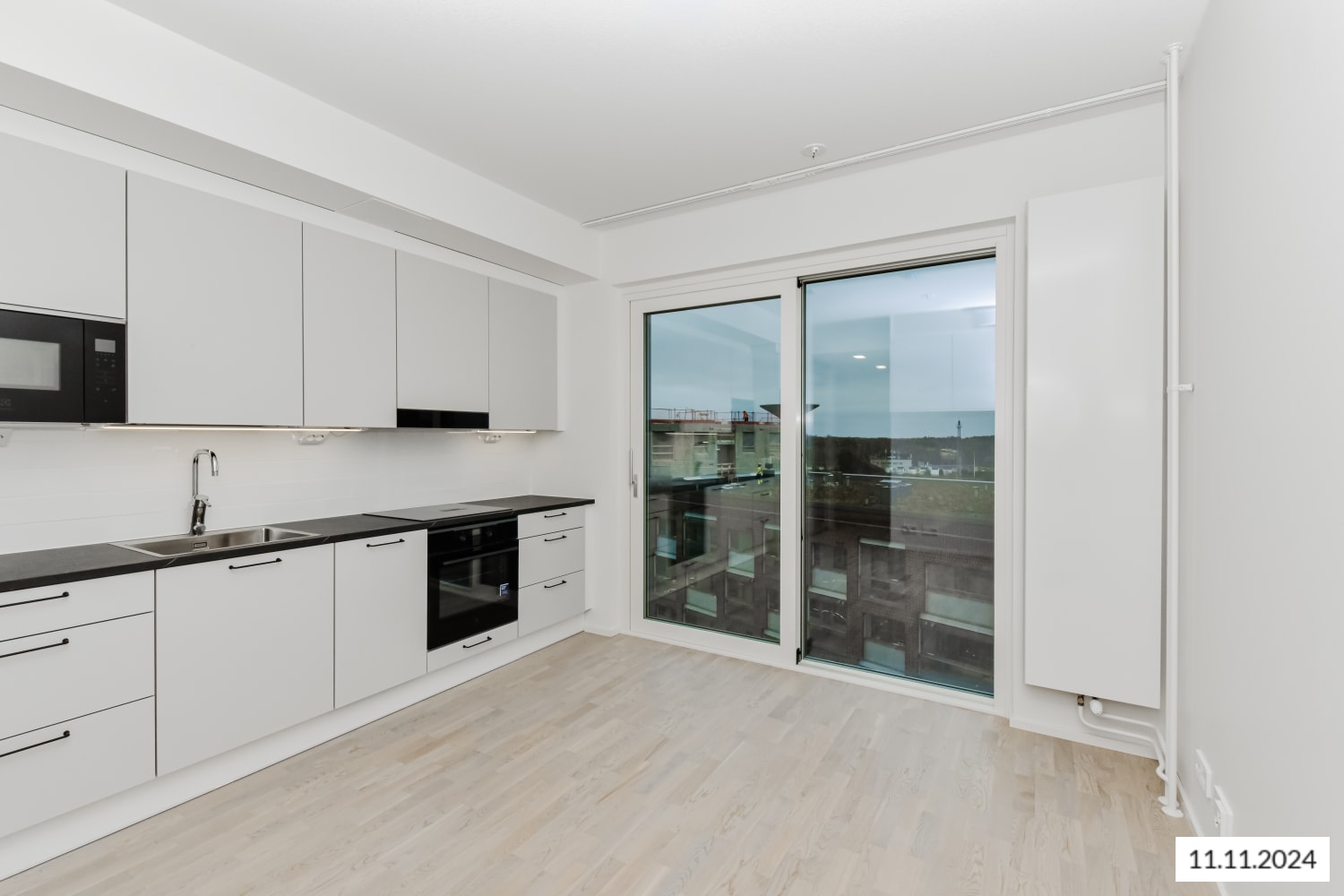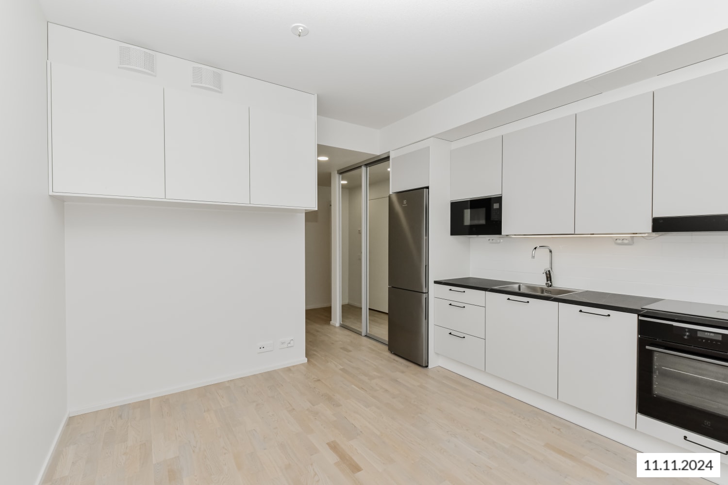 Selkeäpohjaisen yksiön keittiö avautuu osaksi oleskelutilaa. Pikkukodissa on kaakkoon suuntautuvat, tavallista suuremmat ikkunat sekä liukuovellinen ranskalainen parveke.