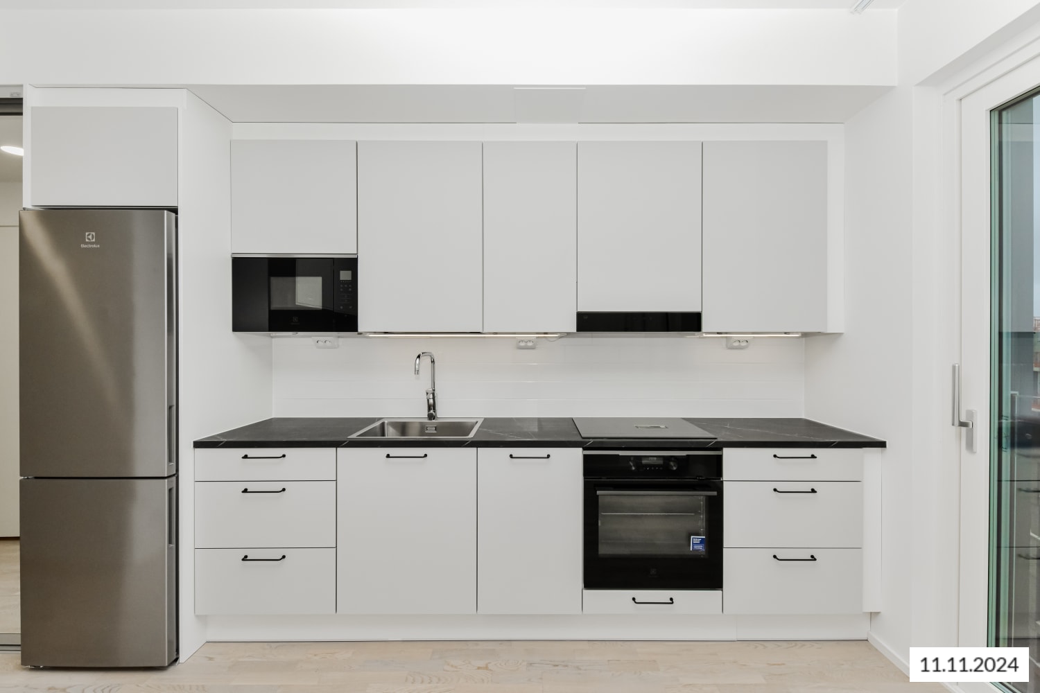 Tyylikäs keittiö on varusteltu muun muassa itsepuhdistavalla pyrolyysiuunilla, mikrolla ja astianpesukoneella.