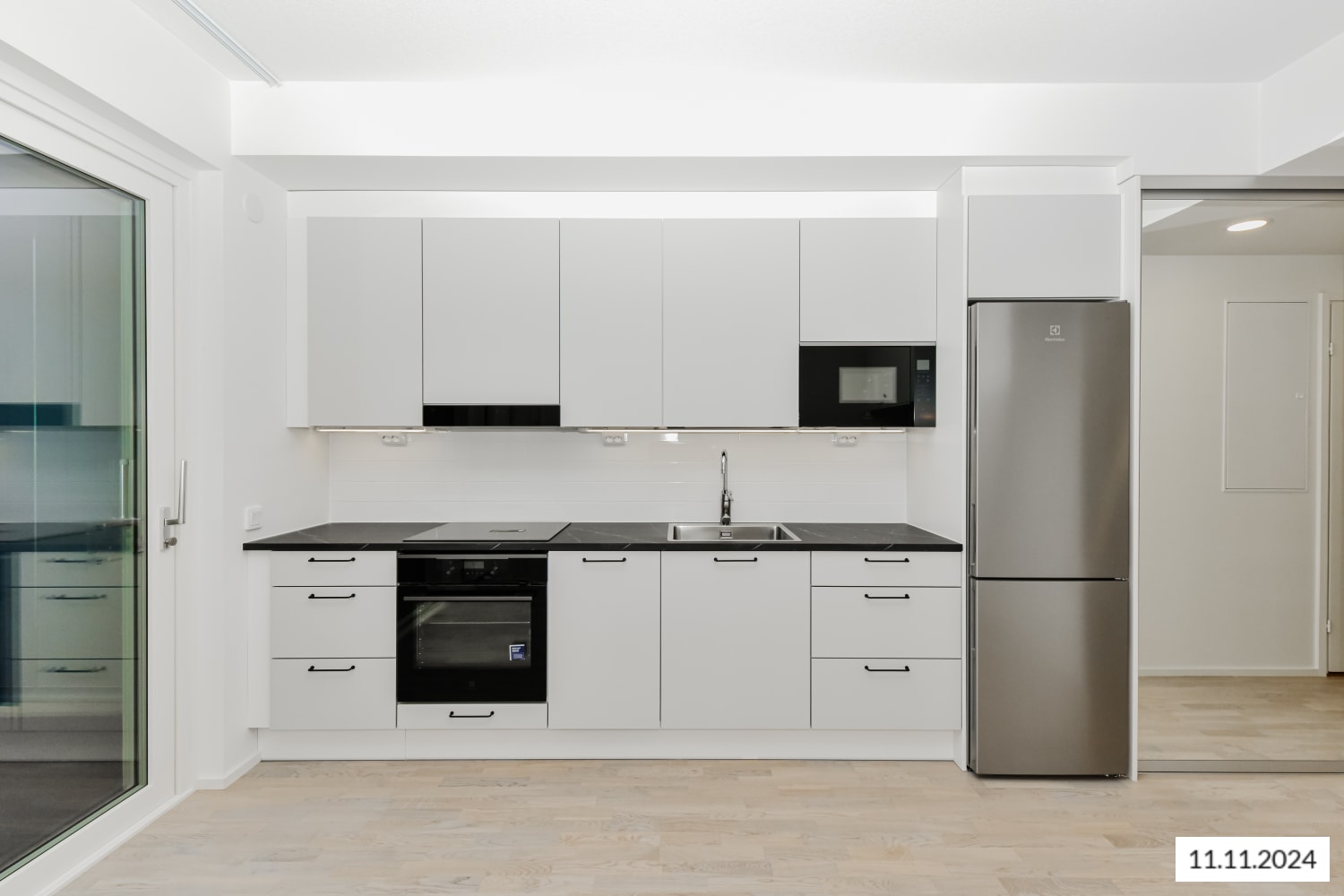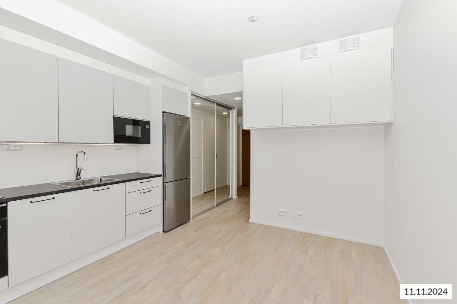 Selkeäpohjaisen yksiön keittiö avautuu osaksi oleskelutilaa. Pikkukodissa on kaakkoon suuntautuvat, tavallista suuremmat ikkunat sekä liukuovellinen, lasitettu parveke.