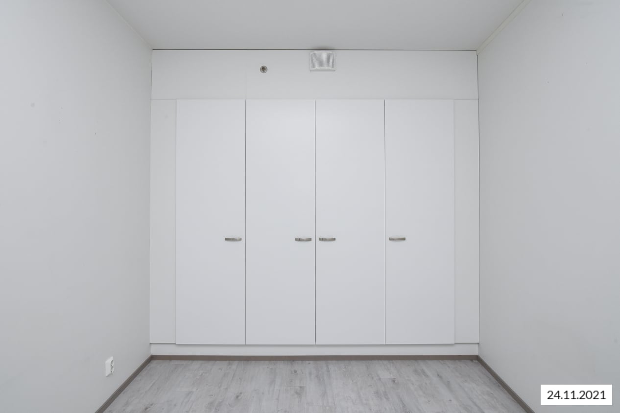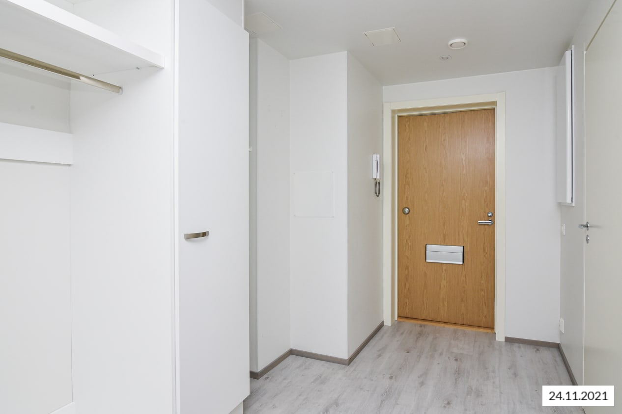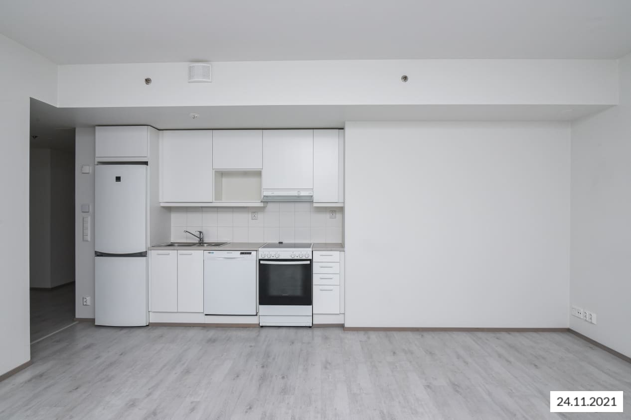 Asuintilojen lattiat ovat valkaistua tammilaminaattia. Makuuhuoneen ja eteisen komerokalusteet ovat valkoisia. Keittiökaapistot ovat valkoiset ja ylä- ja alakaappien välinen tila on laatoitettu valkoisilla laatoilla. Työtaso on vaaleata puupintaa mukailevaa laminaattia. Varustukseen kuuluu keraaminen liesi, jääkaappipakastin, astianpesukone ja varaus mikroaaltouunille.