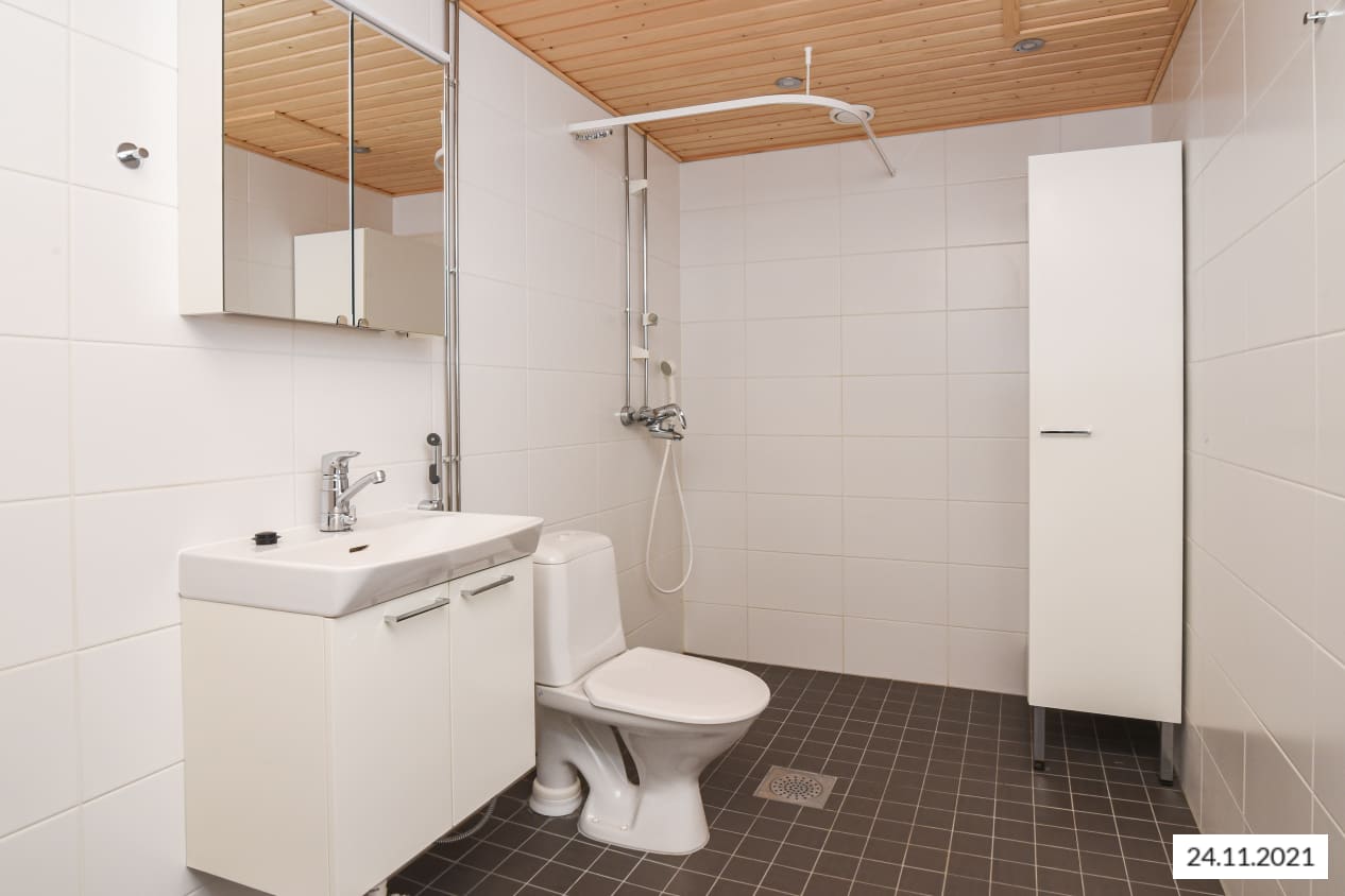 Kylpyhuoneessa seinät ovat valkoista ja lattiat hillityn harmaata laattaa. Pesukoneelle ja kuivausrummulle on varaus.