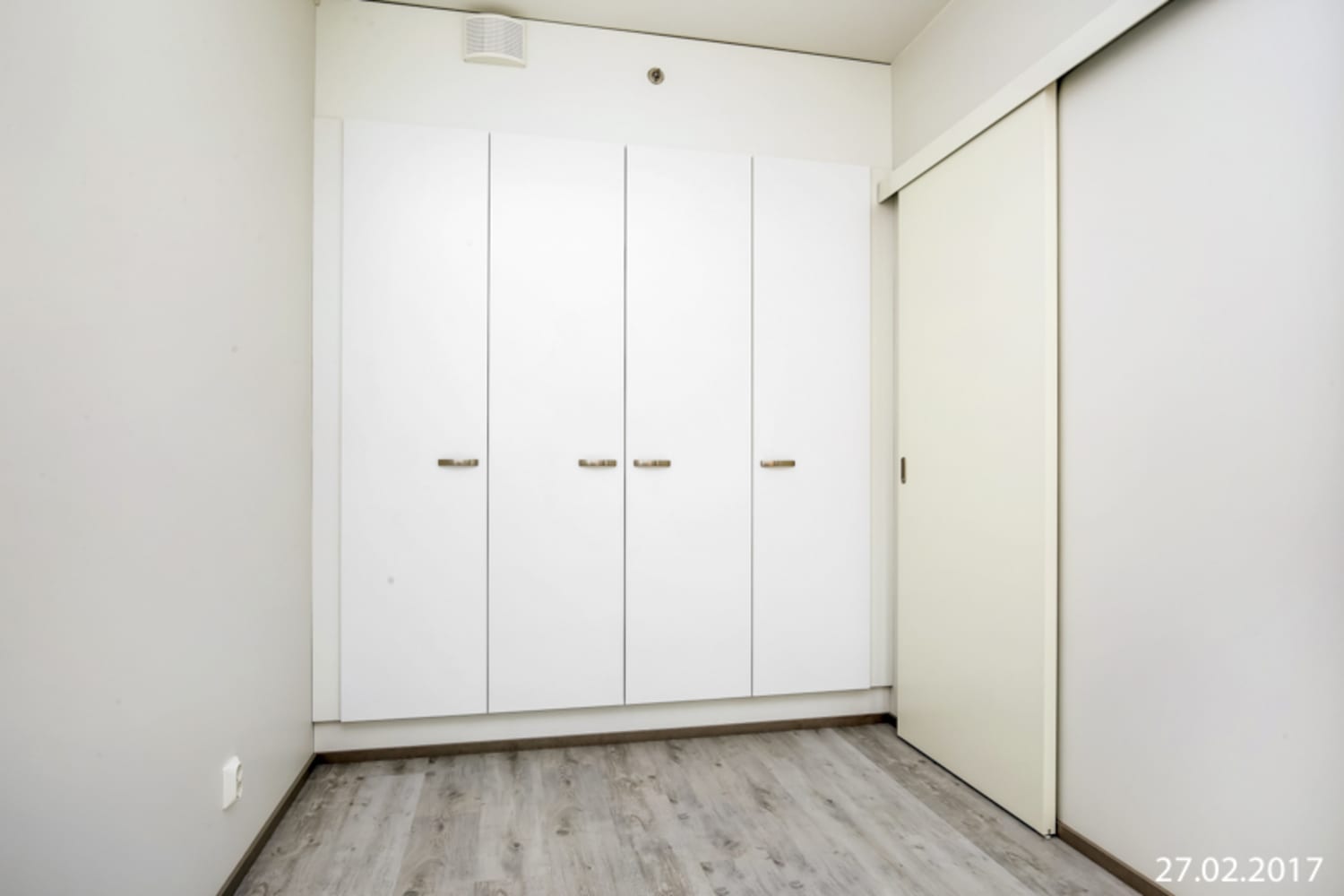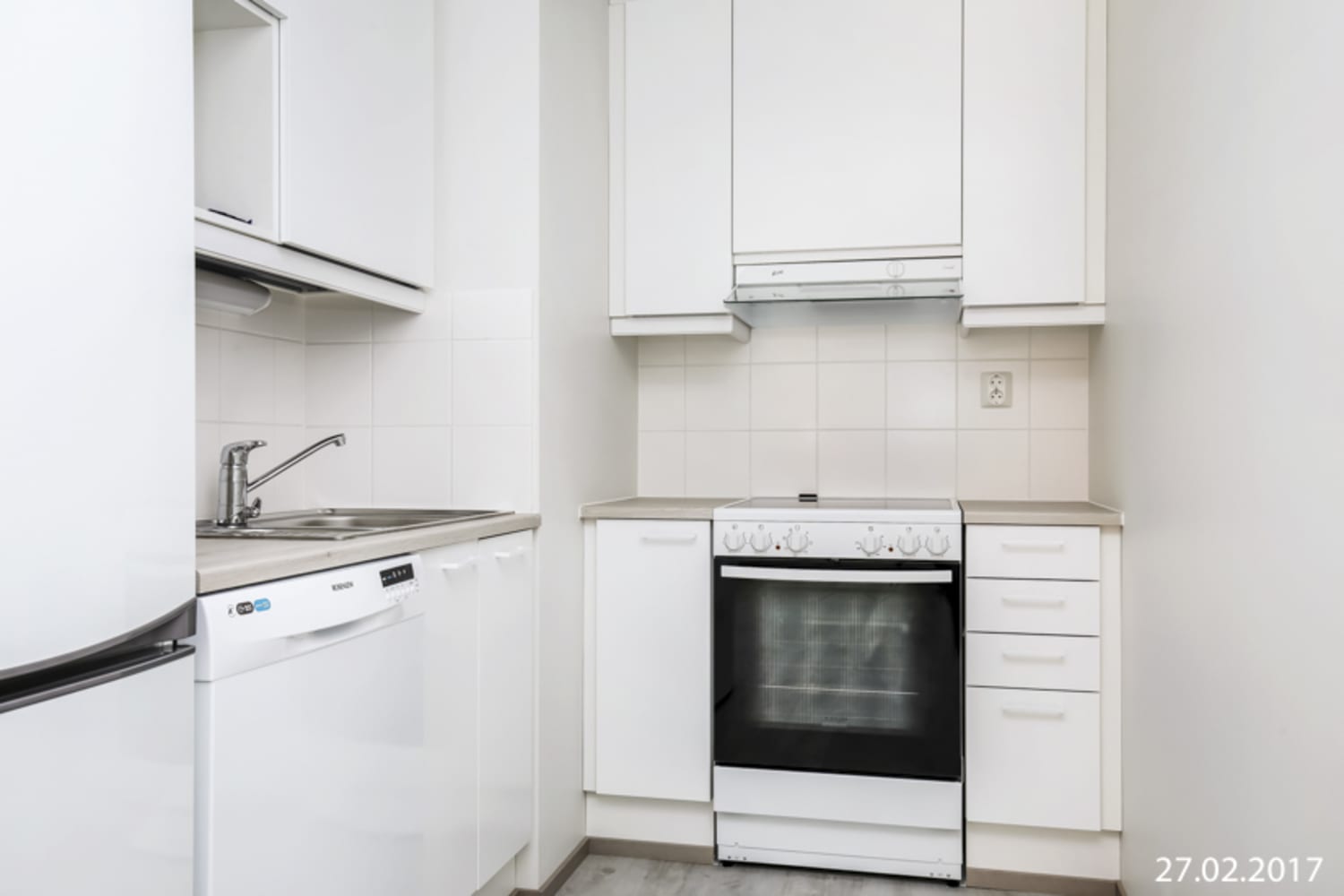 Asuintilojen lattiat ovat valkaistua tammilaminaattia. Makuuhuoneen ja eteisen komerokalusteet ovat valkoisia. Keittiökaapistot ovat valkoiset ja ylä- ja alakaappien välinen tila on laatoitettu valkoisilla laatoilla. Työtaso on vaaleata puupintaa mukailevaa laminaattia. Varustukseen kuuluu keraaminen liesi, jääkaappipakastin, astianpesukone ja varaus mikroaaltouunille.