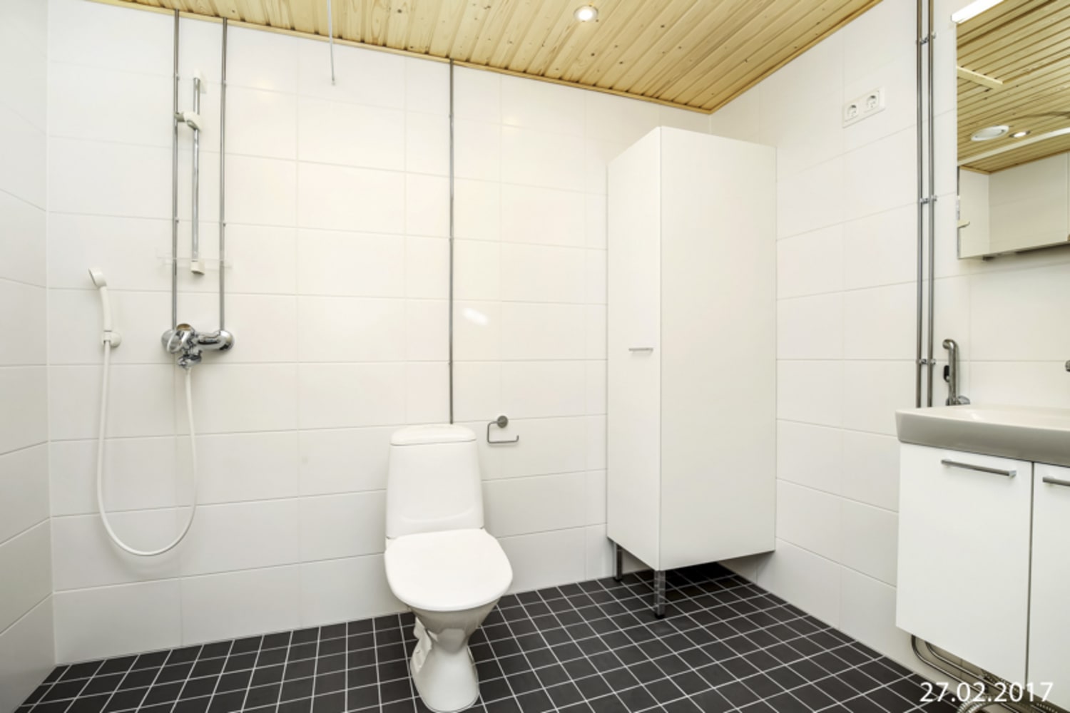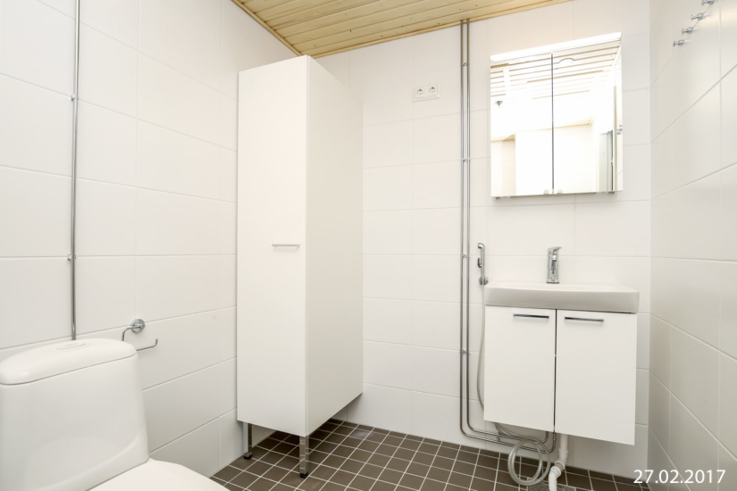 Kylpyhuoneessa seinät ovat valkoista ja lattiat hillityn harmaata laattaa. Pesukoneelle ja kuivausrummulle on varaus.