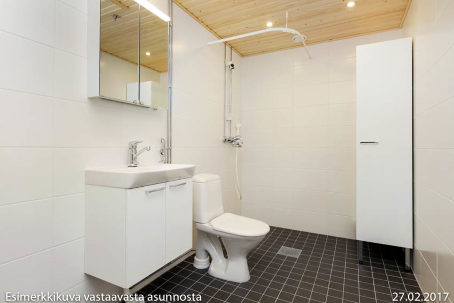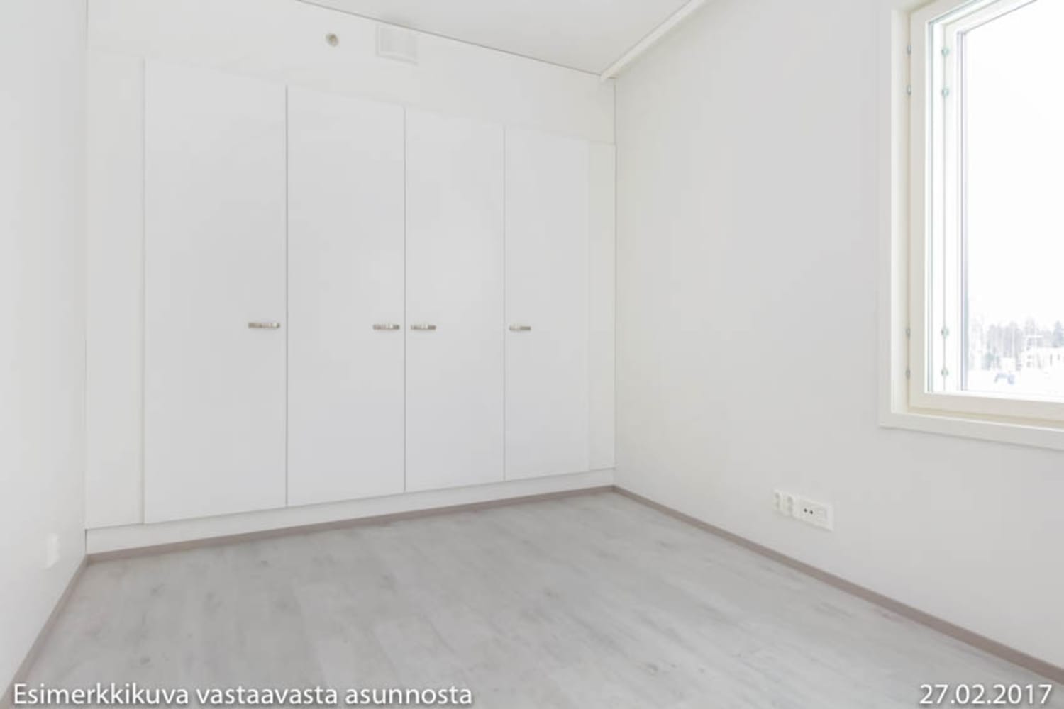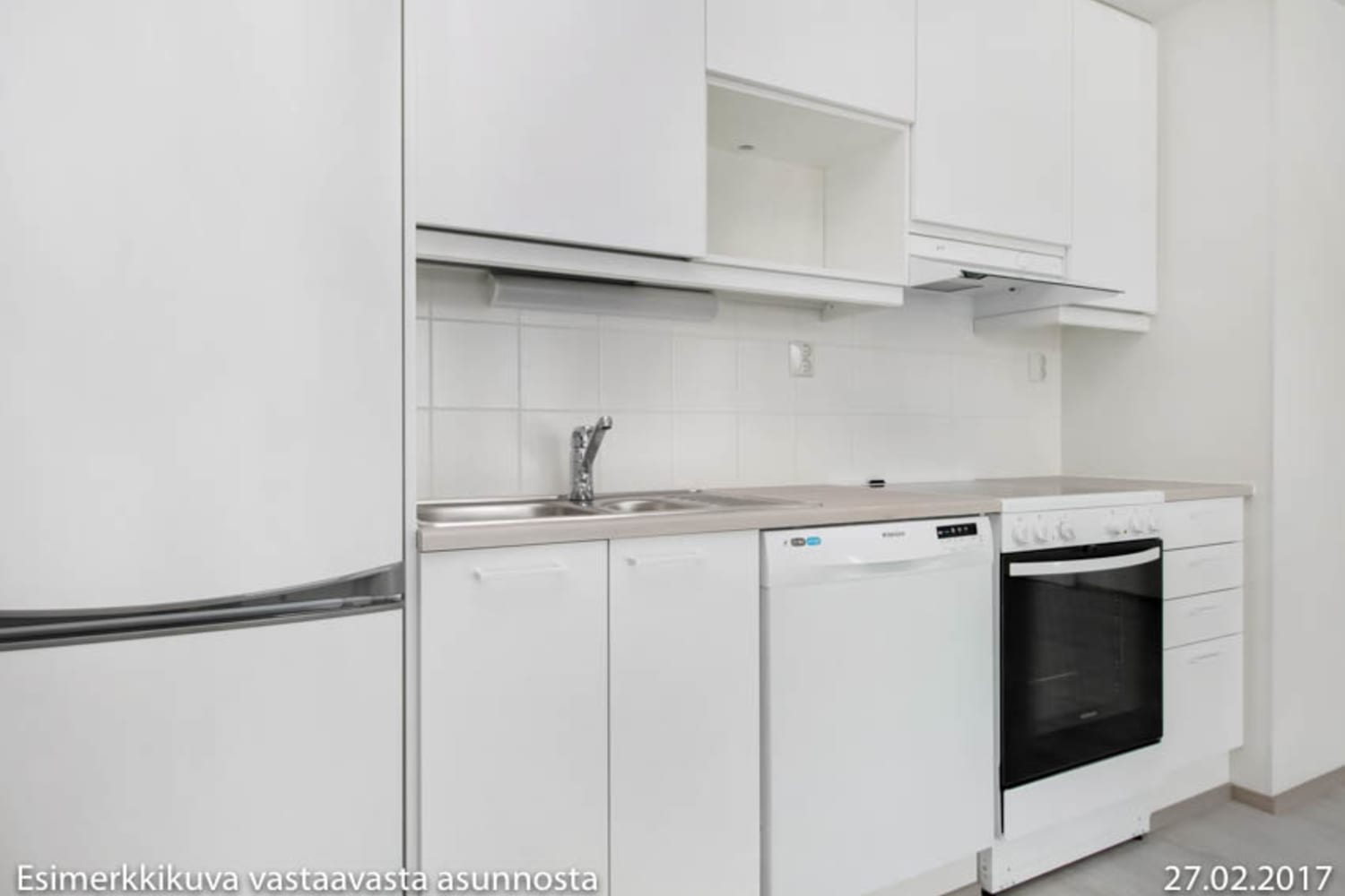 Asuintilojen lattiat ovat valkaistua tammilaminaattia. Makuuhuoneen ja eteisen komerokalusteet ovat valkoisia. Keittiökaapistot ovat valkoiset ja ylä- ja alakaappien välinen tila on laatoitettu valkoisilla laatoilla. Työtaso on vaaleata puupintaa mukailevaa laminaattia. Varustukseen kuuluu keraaminen liesi, jääkaappipakastin, astianpesukone ja varaus mikroaaltouunille. Kylpyhuoneessa seinät ovat valkoista ja lattiat hillityn harmaata laattaa. Pesukoneelle ja kuivausrummulle on varaus.
