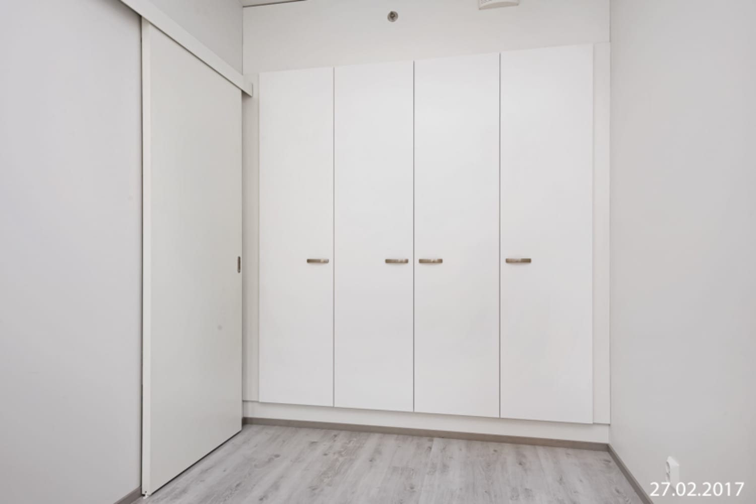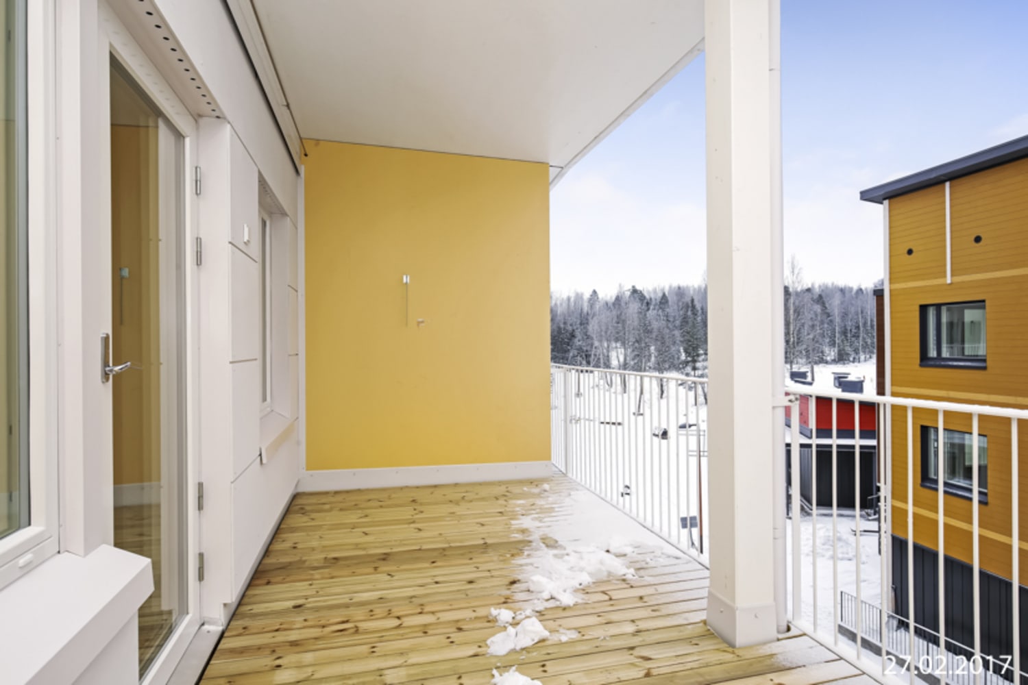 Selkeälinjaisen kaksion ajattoman hillityt materiaalit antavat raamit monenlaiselle sisustamiselle. Makuuhuone on erotettu olohuoneesta kahdella liukuovella ja kulku sinne käy näppärästi kummaltakin puolelta sänkyä. Olohuoneesta pääsee parvekkeelle, joka on suunniteltu niin syväksi, että aurinko ei pääse kuumentamaan asuntoa liikaa kesähelteilläkään.