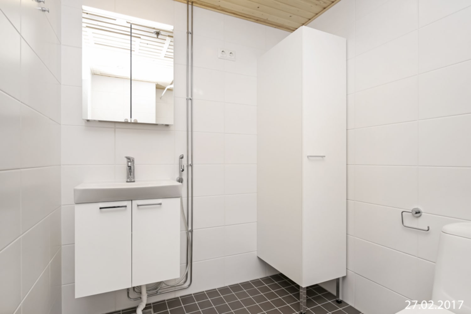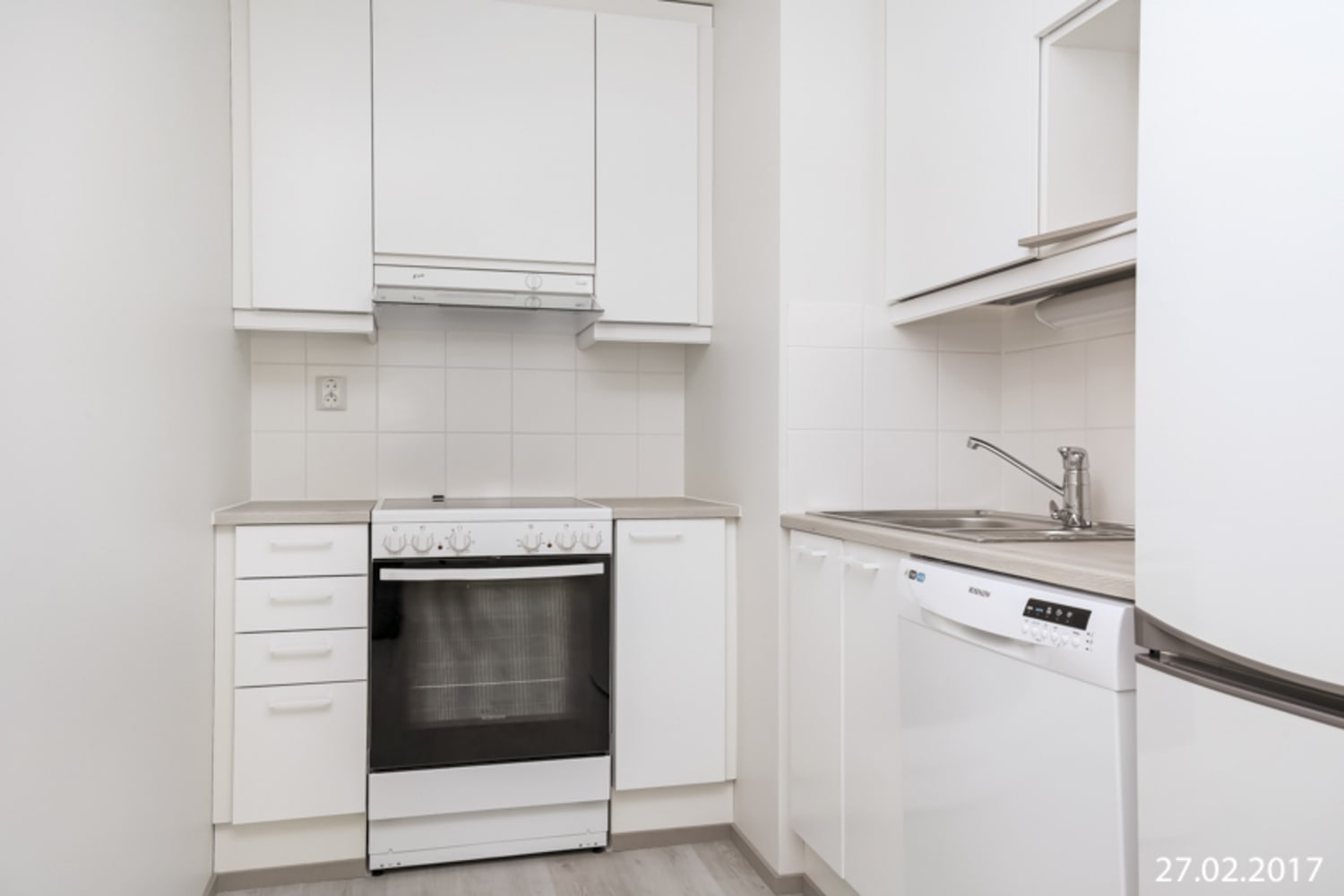 Asuintilojen lattiat ovat valkaistua tammilaminaattia. Makuuhuoneen ja eteisen komerokalusteet ovat valkoisia. Keittiökaapistot ovat valkoiset ja ylä- ja alakaappien välinen tila on laatoitettu valkoisilla laatoilla. Työtaso on vaaleata puupintaa mukailevaa laminaattia. Varustukseen kuuluu keraaminen liesi, jääkaappipakastin, astianpesukone ja varaus mikroaaltouunille.