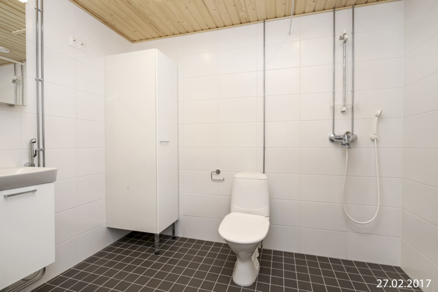 Kylpyhuoneessa seinät ovat valkoista ja lattiat hillityn harmaata laattaa. Pesukoneelle ja kuivausrummulle on varaus.