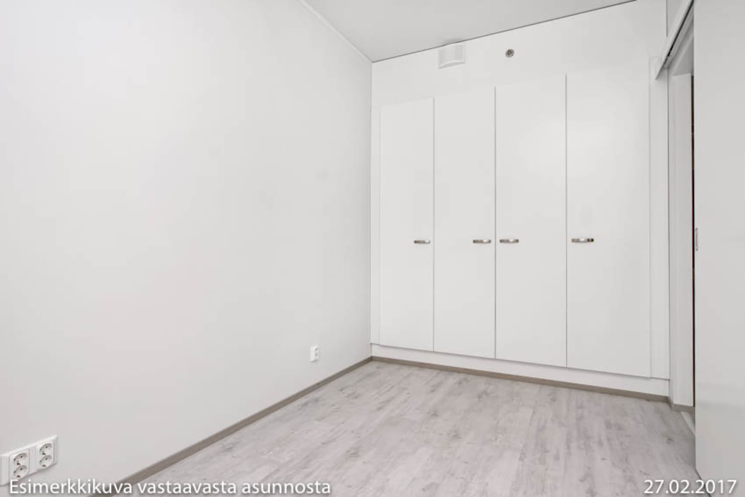 Asuintilojen lattiat ovat valkaistua tammilaminaattia. Makuuhuoneen ja eteisen komerokalusteet ovat valkoisia. Keittiökaapistot ovat valkoiset ja ylä- ja alakaappien välinen tila on laatoitettu valkoisilla laatoilla. Työtaso on vaaleata puupintaa mukailevaa laminaattia. Varustukseen kuuluu keraaminen liesi, jääkaappipakastin, astianpesukone ja varaus mikroaaltouunille.