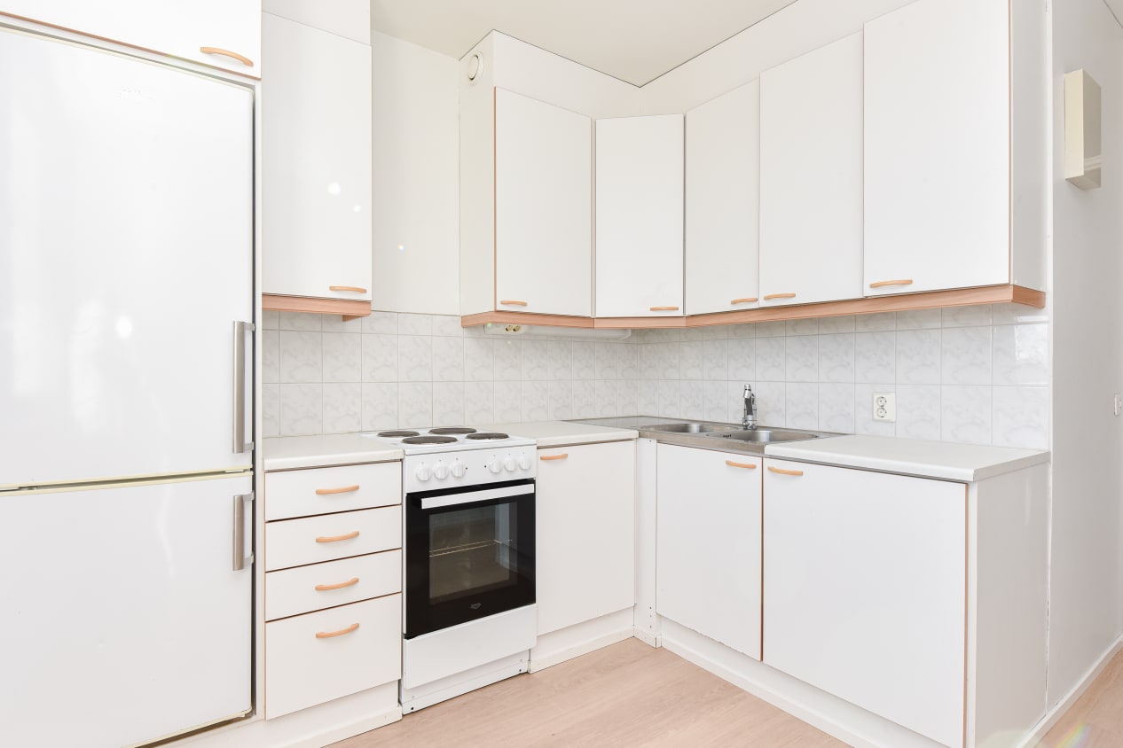 Asuinhuoneiston lattiamateriaalina on laminaatti. Keittiössä on jää-pakastinkaappi, 4-levyinen liesi ja varaus astianpesukoneelle.