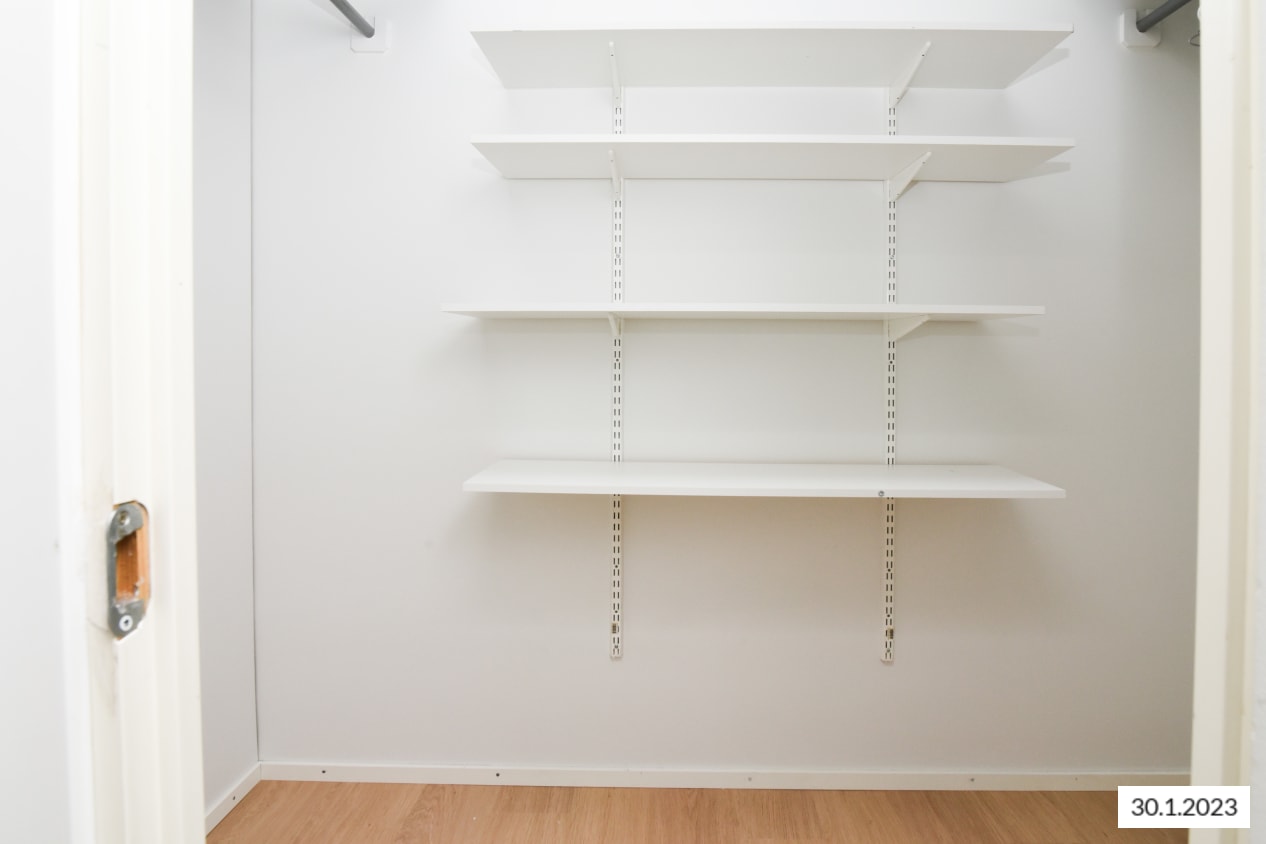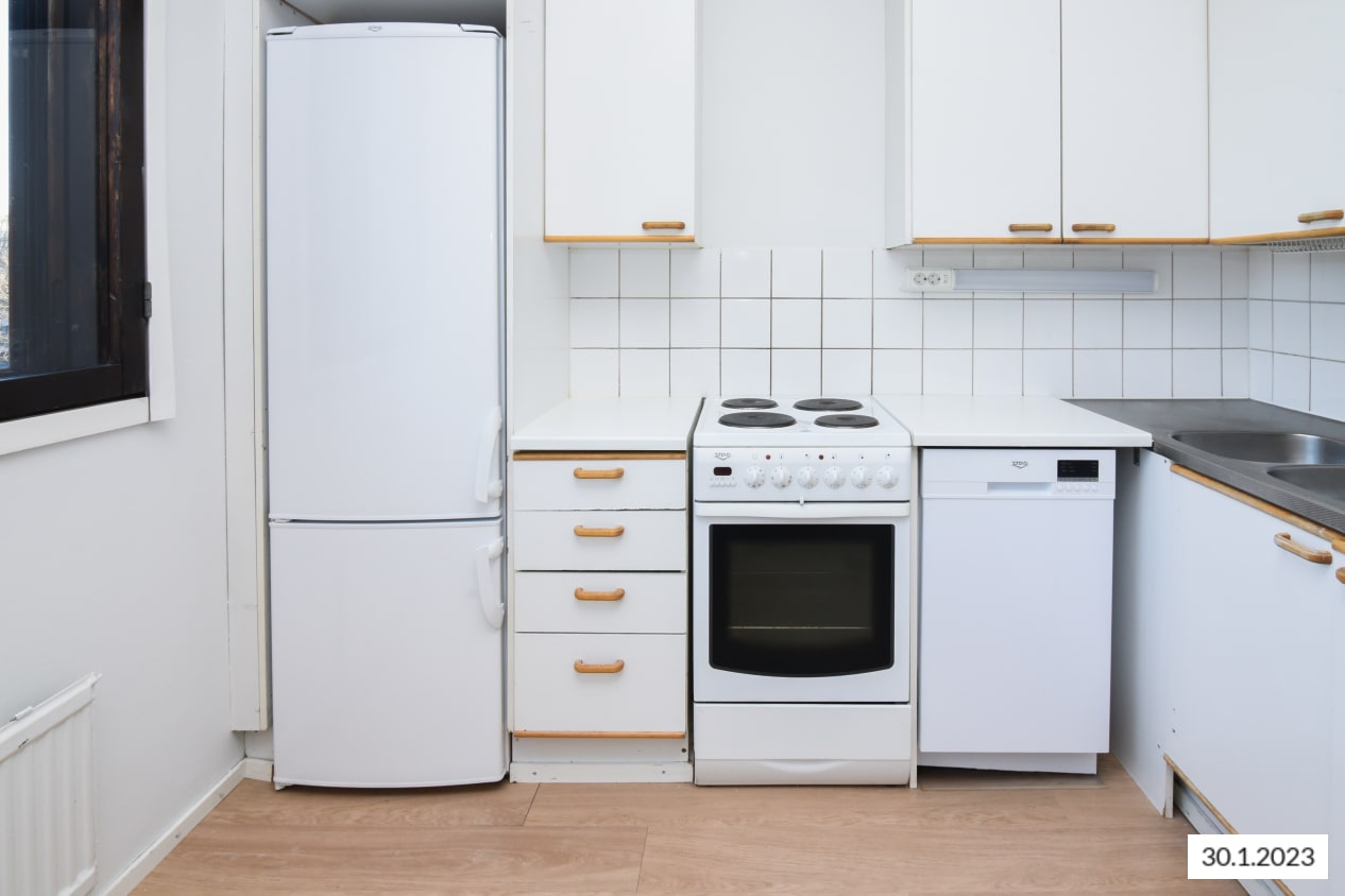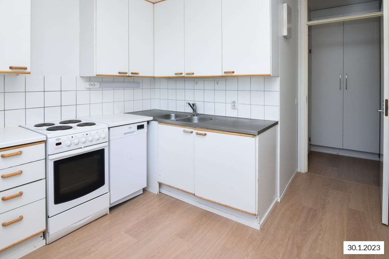 Erillisessä keittiössä on astianpesukone, jää-pakastinkaappi ja nelilevyinen sähköliesi, sinne mahtuu hyvin myös pieni ruokapöytä. Kätevässä vaatehuoneessa on runsaasti säilytystilaa niin talvitakeille kuin harrastusvälineille.