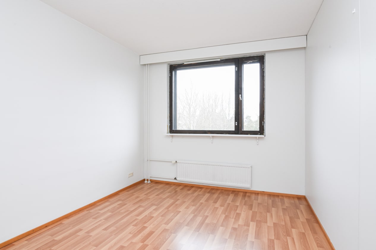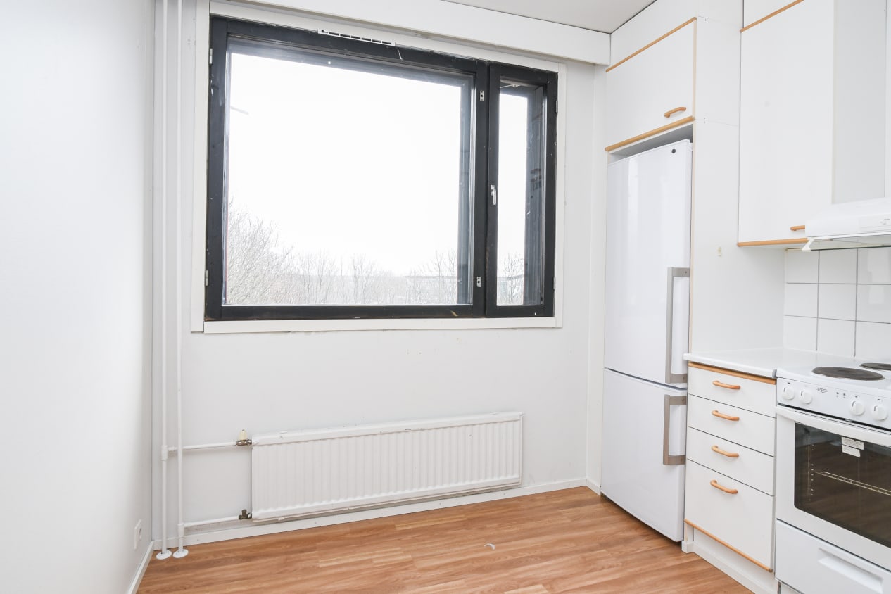 Länteen leikkipihan puolelle avautuva parveke ja tilava, koko perheen kohtaamispaikaksi sopiva olohuone ovat vehreän puiston laidalla vapautuneen kolmion parhaita piirteitä. Asuinhuoneiden lattiamateriaalina on muovimatto.