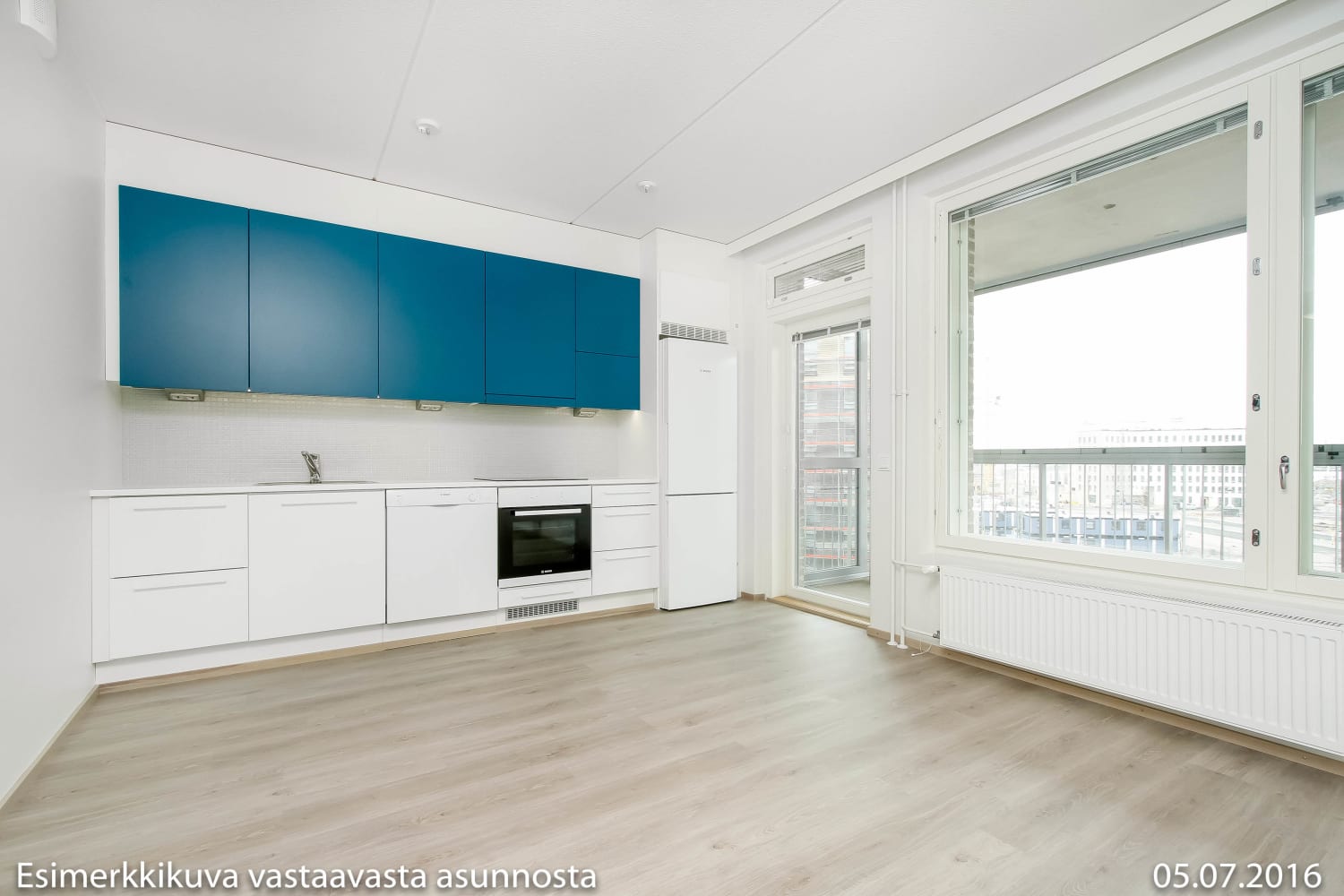 Selkeälinjaisen kaksion olohuone ja avoin keittiö muodostavat yhtenäisen helposti kalustettavan oleskelutilan. Makuuhuoneeseen pääsee kulkemaan kätevästi molemmilta puolin sänkyä. Lasitetulla parvekkeella on mukava nauttia vaikkapa iltapäiväkahvit.