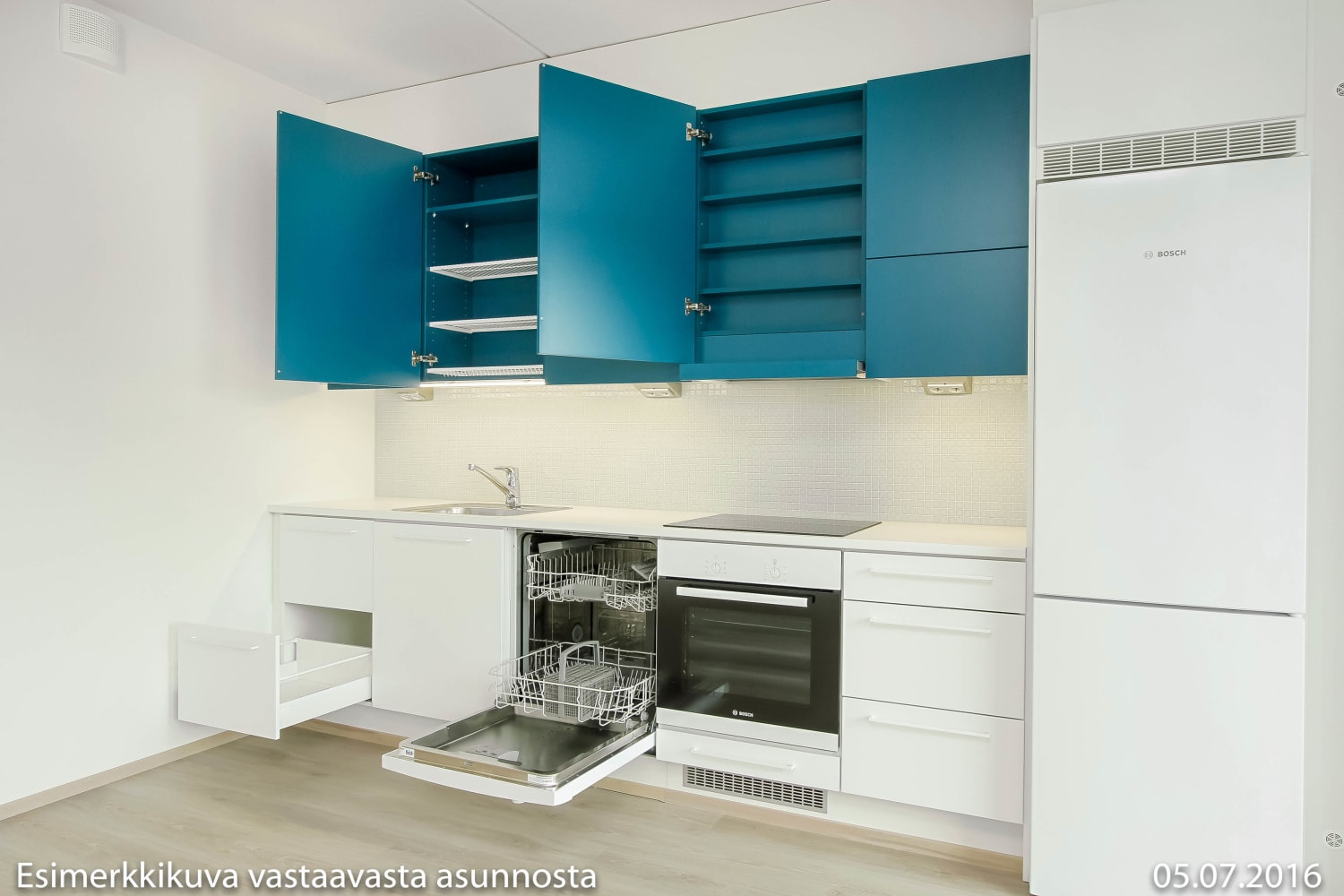 Modernin kodin lattiat ovat laminaattia. Keittiön alakaappien ja korkeiden kaappien ovet ovat valkoiset ja yläkaappien ovet ja avohyllyköt ovat petroolin siniset. Työtasot ovat valkoista laminaattia ja ylä- ja alakaappien välinen tila on laatoitettu lasimosaiikkilaatoilla. Keittiön varusteena on keraaminen liesitaso ja kalusteuuni, liesikupu, jää-pakastinkaappi, astianpesukone ja tilavaraus mikroaaltouunille. Kodinkoneet ovat valkoisia.