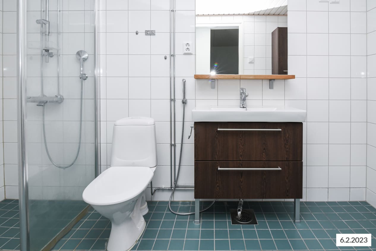 Selkeälinjaisen kolmion olohuone ja avoin keittiö muodostavat avaran, yhtenäisen oleskelutilan, joka jatkuu läpi talon. Tilan olohuoneen puoleisessa päädyssä on laistettu parveke ja keittiön puolelta aukeaa ranskalainen parveke. Makuuhuoneita erottaa reilun kokoinen kylpyhuone. Modernin kodin lattiat ovat laminaattia. Keittiön alakaappien ja korkeiden kaappien ovet ovat valkoiset ja yläkaappien ovet ja avohyllyköt ovat petroolin siniset. Työtasot ovat valkoista laminaattia ja ylä- ja alakaappien välinen tila on laatoitettu lasimosaiikkilaatoilla. Keittiön varusteena on keraaminen liesitaso ja kalusteuuni, liesikupu, jää-pakastinkaappi, astianpesukone ja tilavaraus mikroaaltouunille. Kodinkoneet ovat valkoisia. Laatoitetun kylpyhuoneen seinät ovat kiiltävän valkoiset ja lattiat petroolin siniset. Kalusteet ovat tummanruskeaa puukuviota. Pesukoneelle ja kuivausrummulle on tilavaraus.
