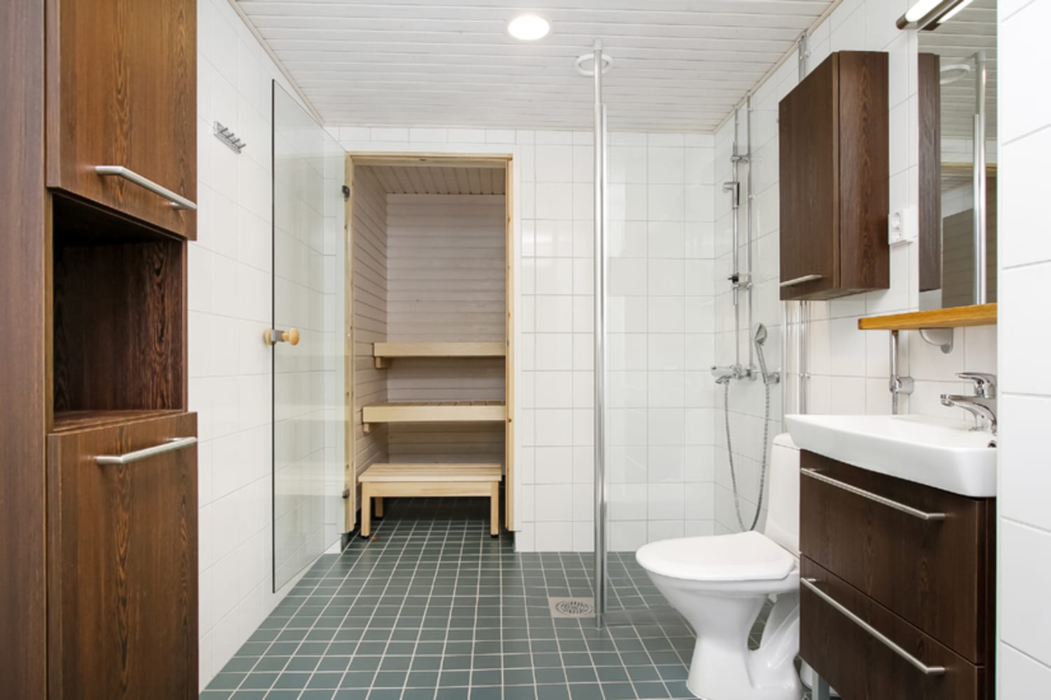 Modernin kodin lattiat ovat laminaattia. Keittiön alakaappien ja korkeiden kaappien ovet ovat valkoiset ja yläkaappien ovet ja avohyllyköt ovat petroolin siniset. Työtasot ovat valkoista laminaattia ja ylä- ja alakaappien välinen tila on laatoitettu lasimosaiikkilaatoilla. Keittiön varusteena on keraaminen liesitaso ja kalusteuuni, liesikupu, jää-pakastinkaappi, astianpesukone ja tilavaraus mikroaaltouunille. Kodinkoneet ovat valkoisia. Laatoitetun kylpyhuoneen seinät ovat kiiltävän valkoiset ja lattiat petroolin siniset. Kalusteet ovat tummanruskeaa puukuviota. Pesukoneelle ja kuivausrummulle on tilavaraus.