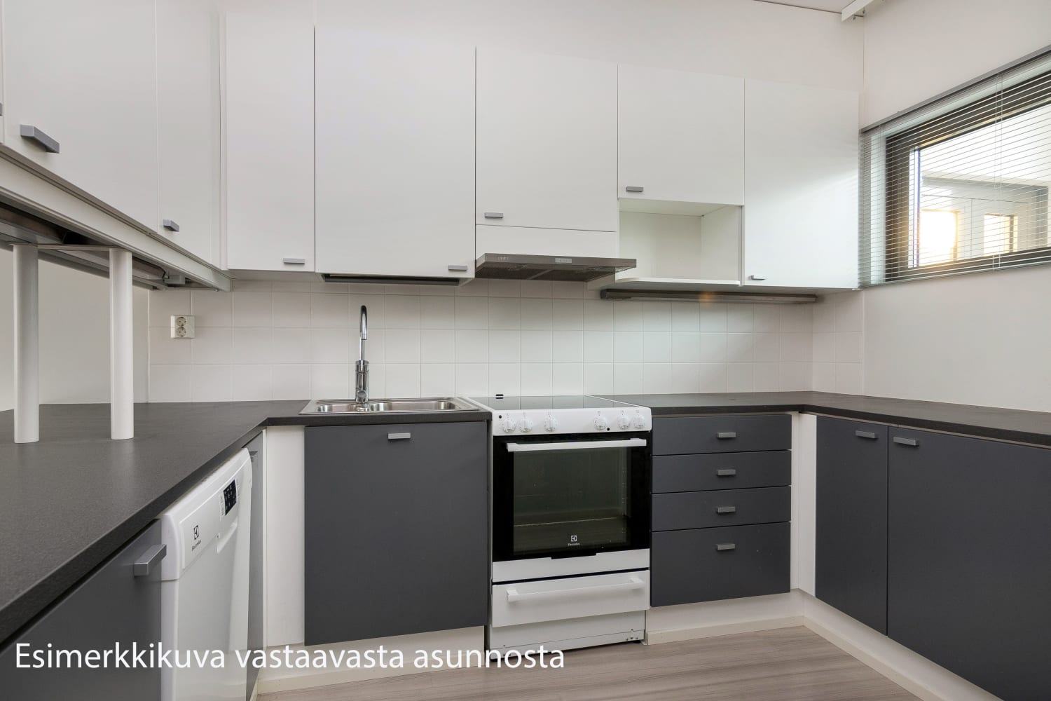 Asuinhuoneiden laminaattilattioissa on valkolakatun tammen tuntua. Kylpyhuoneessa on tummanharmaa laattalattia, valkoiseksi kaakeloidut seinät ja varpaiden alla ihana mukavuuslattialämmitys. Valoisassa keittokomerossa on sileäpintainen kaapisto (yläkaapit valkoiset ja alakaapit tyylikkään harmaat). Vakiovarusteina ovat selkeälinjainen keraaminen liesi kiertoilmauunitoiminnolla, jää-pakastinkaappi sekä astianpesukone, kaikki energialuokkaa A. Luhtikäytävän puoleisessa ikkunassa on sälekaihdin.