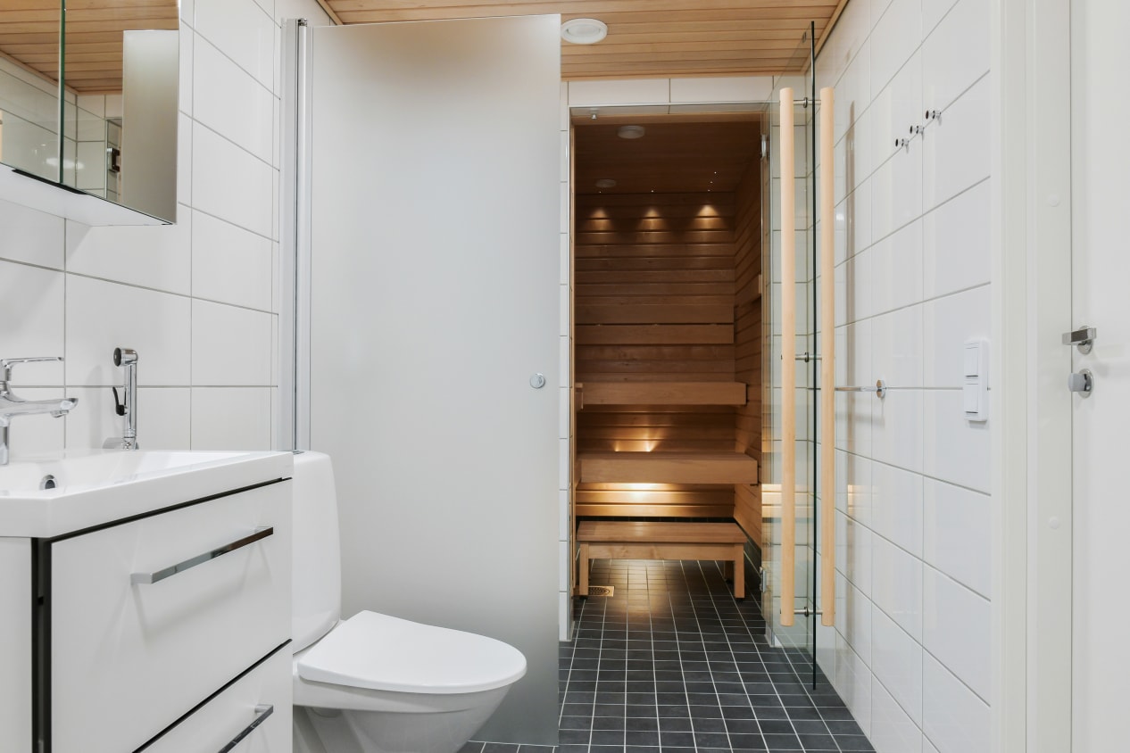 Kylpyhuoneessa ja erillisessä wc:ssä on valkoiset SATOn Kide-malliston kalusteet. Seinät ovat valkoista laattaa ja lattian laatoituksen sävy on tyylikkäästi harmaa. Pesukoneelle on oma paikkansa.